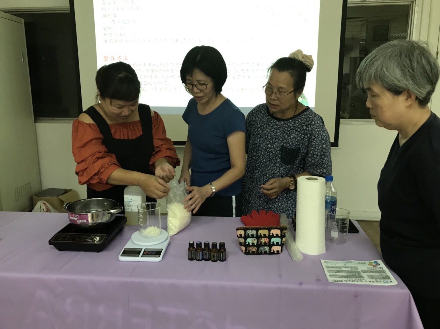 7月在弘光科大開辦的「創意紓壓手作課」,授課老師謝宛庭曾經在2年前參加到宅坐月子服務人員訓練及托育人員訓練班,平常除了當照顧產後媽媽的坐月子服務員外,也教授精油香皂製作,更貼心的製作讓媽媽及寶寶可以使用的產品。