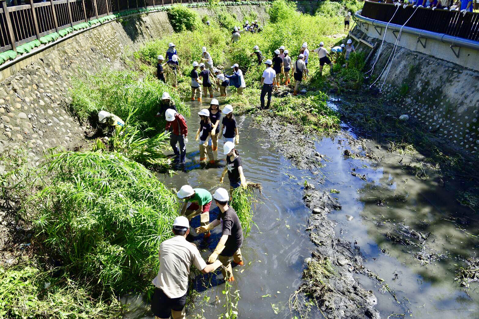台中市政府水利局推動南屯區黎明溝水環境改善工程,日前與黎明國中合作舉辦研習,將生物教室拉至戶外,邀請50位學生一起認識淨水植物並移除外來種,體驗如何復育河溝生態。黎明溝整治今年2月開工,目前工程進度80%,兩側基礎護岸已完成,後續將結合步道及堤岸緩坡,創造黎明溝人本的親水生態空間。
