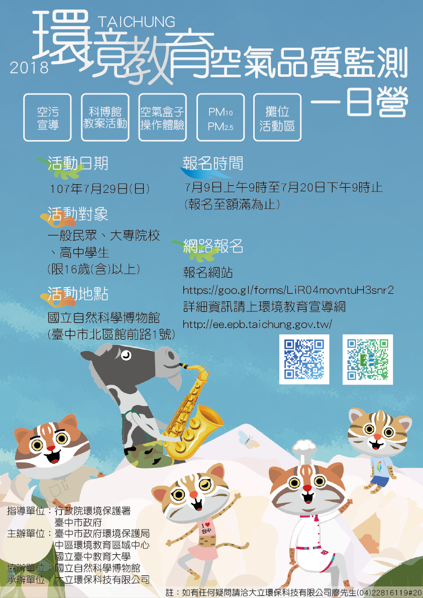 活動報名網址 https://goo.gl/uqWmAv ,限額120名,全程參與者,可領取結業證書,並贈送精美小禮品,歡迎16歲(含)以上,對空汙議題有興趣的民眾踴躍報名參加,相關訊息請詳見環境教育宣導網( http://ee.epb.taichung.gov.tw/ )查詢,或洽專線大立環保科技有限公司廖先生,電話(04)2281-6119#20。