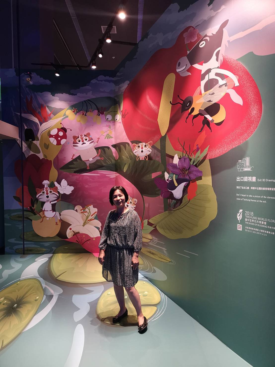 位於台中市政府惠中樓1樓的台中市政願景館,今年3月正式開幕營運,建置擴增實境(AR)技術、大型手繪牆面、互動光雕、360環景照片等新科技設施,呈現台中的過去與未來。迎接台中花博即將開幕,市府於願景館出口處設置3D錯視畫,結合文心蘭、劍蘭、百合、火鶴等在地花卉意象,讓民眾藉由特殊視角與構圖,宛如真的「站」在綠葉上,與花博吉祥物石虎家族與歐米馬,一起合影留念,歡迎踴躍參觀。