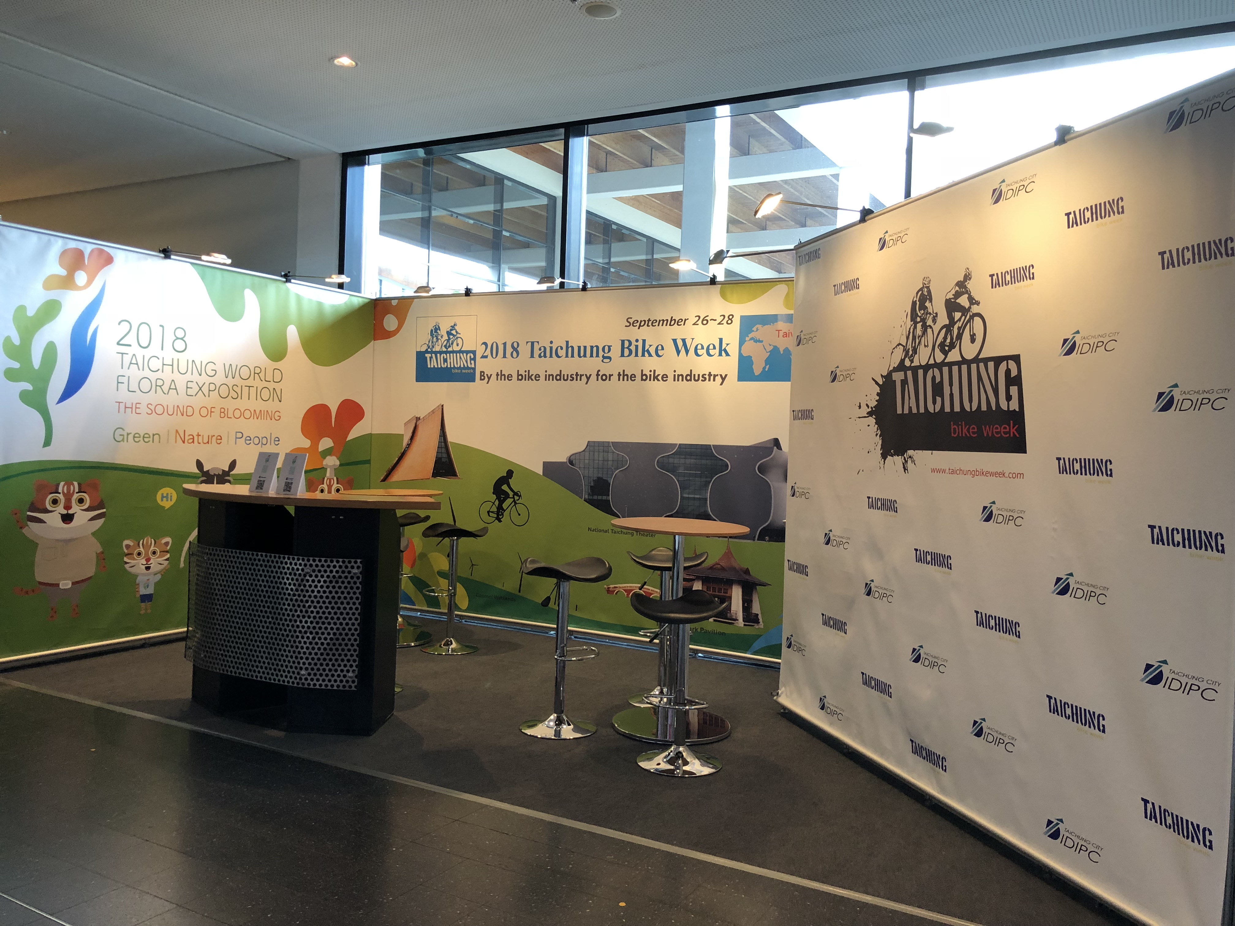 台中市工商發展投資策進會為推動自行車產業發展,參加今年國際自行車產業指標展覽「2018德國福吉沙芬自行車展(EUROBIKE)」,設立服務攤位宣傳「2018台中自行車週」,邀請各國買主到台中看展並採購,為台中自行車產業創造更大商機。