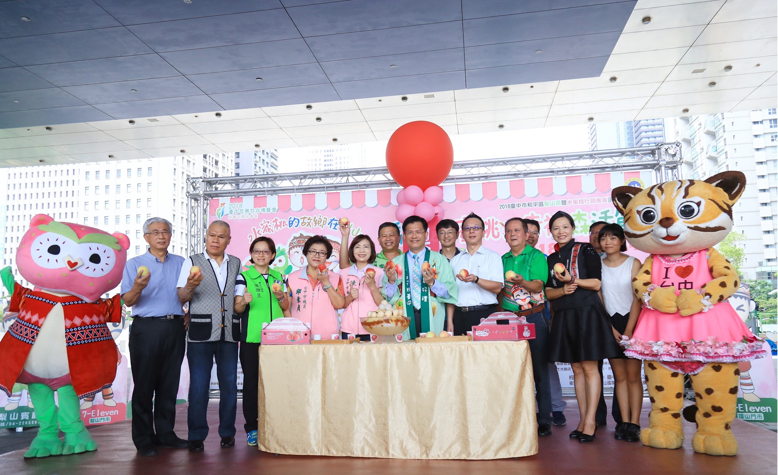 「2018梨山水蜜桃‧幸福森活節記者會」今(18)日在台灣大道市政大樓川堂舉行,林市長在副市長張光瑤、農業局長王俊雄、觀光旅遊局長陳盛山、和平區長林建堂、后里區代理區長張大春的陪同下出席。林市長頒發水蜜桃禮盒給梨山觀光大使名字發想者謝翔沄,吉祥物意象結合貓頭鷹與水蜜桃,可愛吸睛,花博吉祥物樂虎也出席同樂。