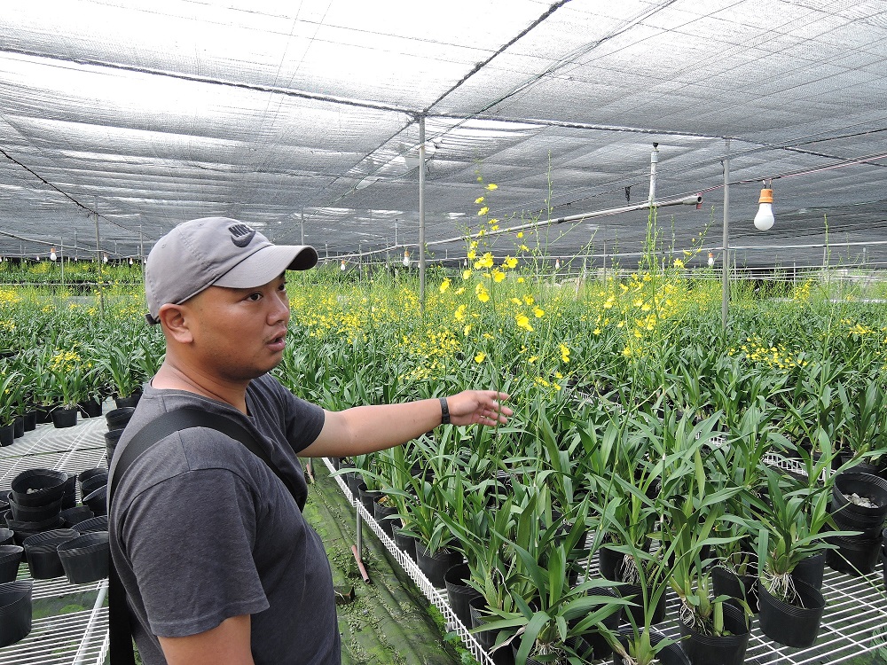 屬農二代的陳帝緯,分享種文馨蘭的經驗,他退伍時陪父母在新社頭嵙山地區種植文心蘭,佔地一甲多,種植二、三年後,為跳脫上一代慣行的農法,選擇在后里地區租地,並加入台中花卉產銷班,積極參加市府舉辦的各種農作物研習講座,並透過與農友交流及農改場、農試所相關農業課程學習,以創新方式及觀念進行栽種,應用在花卉的種植。