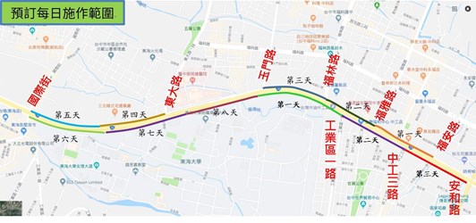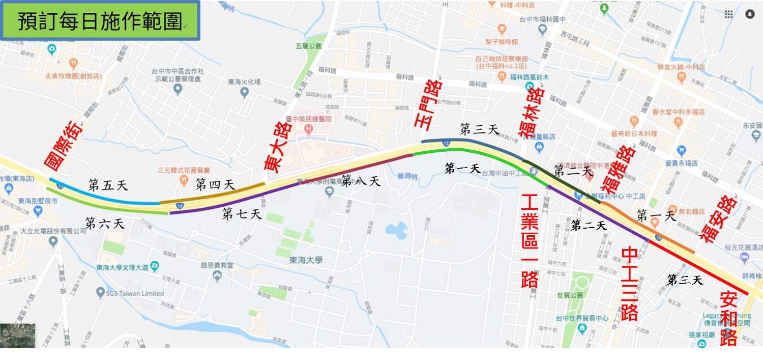 為改善台灣大道四段機慢車道路面損壞不平問題,台中市政府建設局預計於8月1日進行台灣大道西行(福安路至玉門路、東大路至國際街)及東行(國際街至安和路)的機慢車道人手孔蓋調平下地等路平前置作業,8月3日起進行路平工程,每日晚間23時30分至翌日5時30分施工,希望將交通影響降至最低,若施工順利可望於8月18日完工。