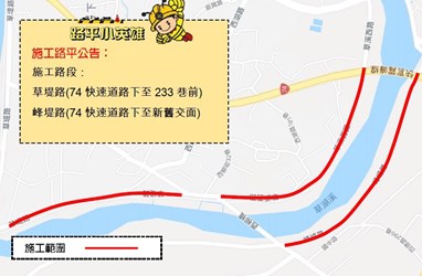 草堤路施工範圍自台74線、中投公路快速道路下方,至草堤路233巷前;峰堤路施工範圍則從台74線、中投公路快速道路下方,到前期改善的新舊交界止,改善區段全長約3.4公里。