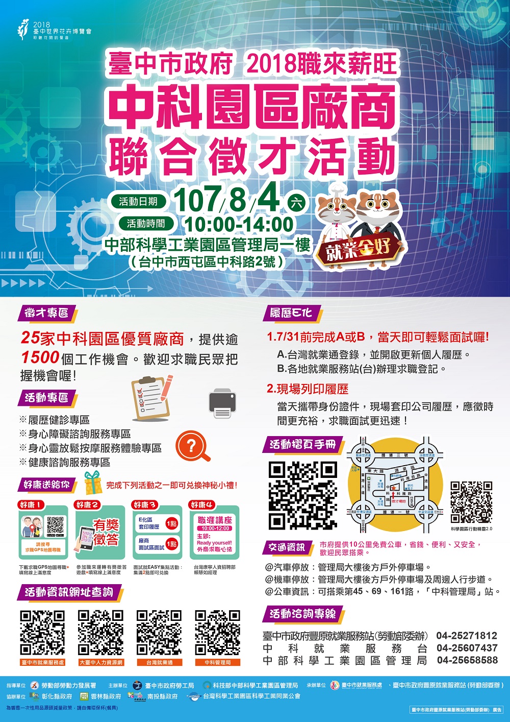 8月4日(星期六)10時至14時,在中部科學工業園區管理局一樓(西屯區中科路2號)將有「2018職來薪旺-中科園區廠商聯合徵才活動」,邀請25家優質廠商、提供逾1,500個工作機會,歡迎踴躍參加!洽詢專線04-25271812豐原就業服務站。