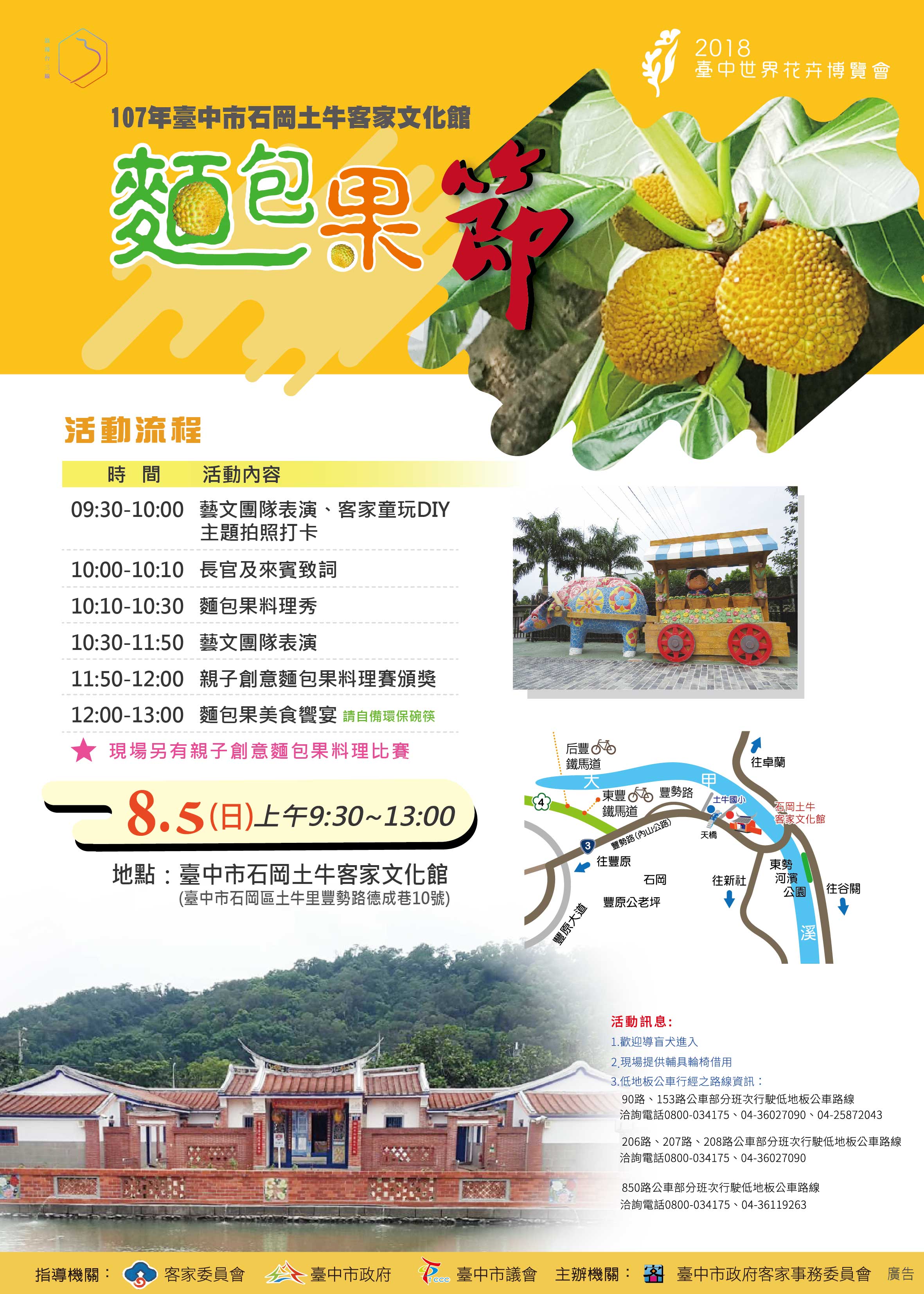 感受夏日荷風,8月4日(星期六)歡迎前往東勢林業文化園區參加園遊會,現場有二胡演奏、扯鈴及舞蹈表演,還有氣球吃人魔術及調酒秀和捏麵人DIY等豐富活動,大小朋友一起來同樂吧!詳情請至市府地方稅務局網站( http://bit.ly/2AyaTo8 )查詢;另外,8月5日(星期五)將於石岡土牛客家文化館,舉辦麵包果節活動, 除有麵包果料理創作的精彩表演,還有客家童玩DIY、主題拍照打卡區,週末攜家帶眷一起到石岡土牛客家文化館熱鬧一夏!詳情請至活動網站(http://bit.ly/2O7IqYe)查詢。 本週還有不少展覽、演講等活動,更多資訊,請見「中市週末活動看板0804_0805」。(8/3*6)*新聞局