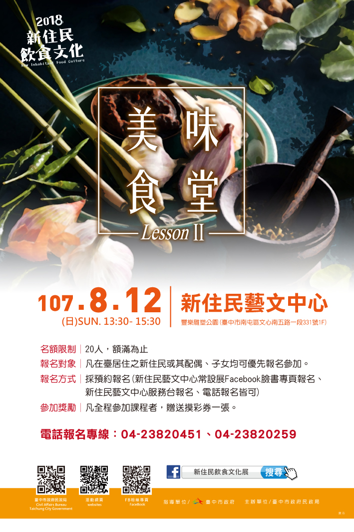 8月12日(星期日)下午1時30分在台中市新住民藝文中心,舉辦「2018新住民飲食文化-美味食堂」第2場次,邀請越南新住民擔任講師,現場教學並品嘗越南風味料理,限額20人免費參加,歡迎新住民及其家人踴躍報名,報名專線04-23820451。