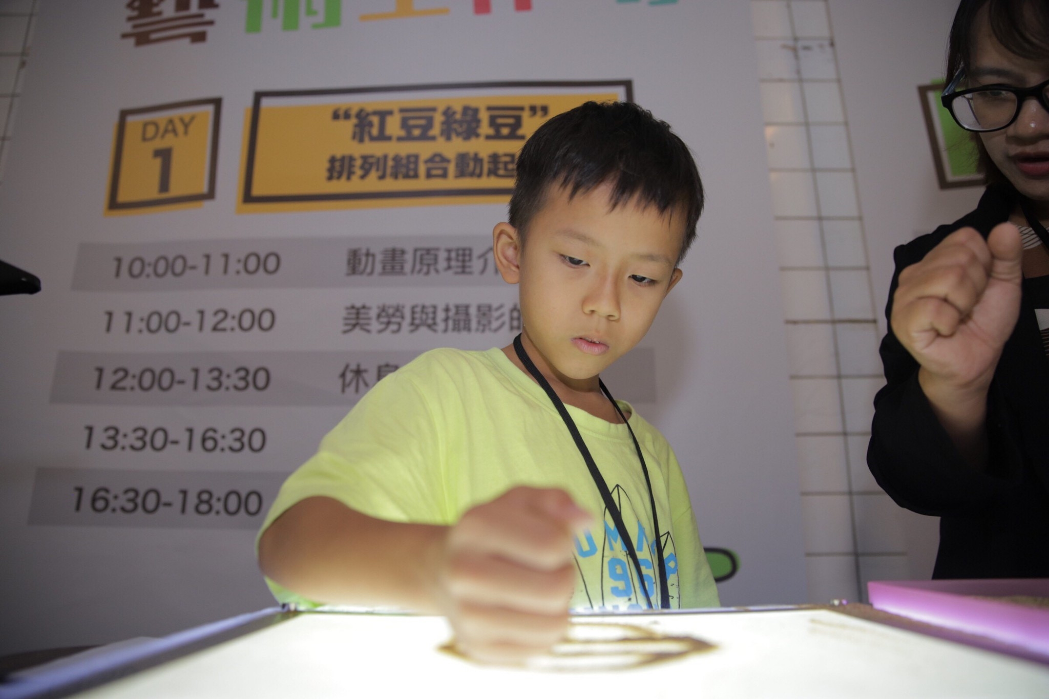此次藝術工作坊共分兩梯次、各為期3天,邱導演讓小朋友先感受紅豆、綠豆、咖啡渣、海沙等創作媒材,進而引導小朋友創作角色、場景,發揮創造力及想像力創作動畫故事,同時也認識動畫基本原理。