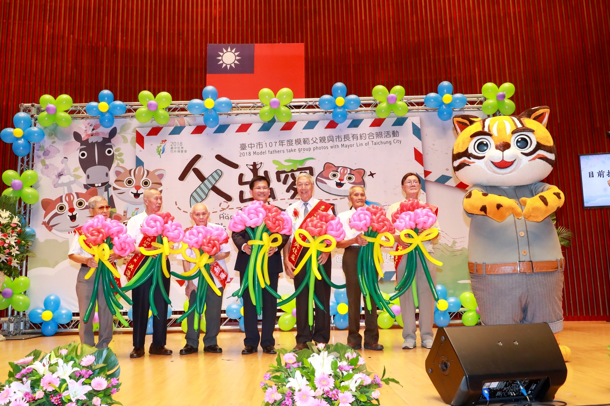 今日「與市長有約合照」在台灣大道市政大樓舉行,許多模範父親帶著一家大小與林市長合影,場面溫馨。台中花博吉祥物「石虎家族」中的虎爸,驚喜現身與模範父親代表合影留念,並獻上氣球花束給林市長,也祝林爸爸「父親節快樂!」