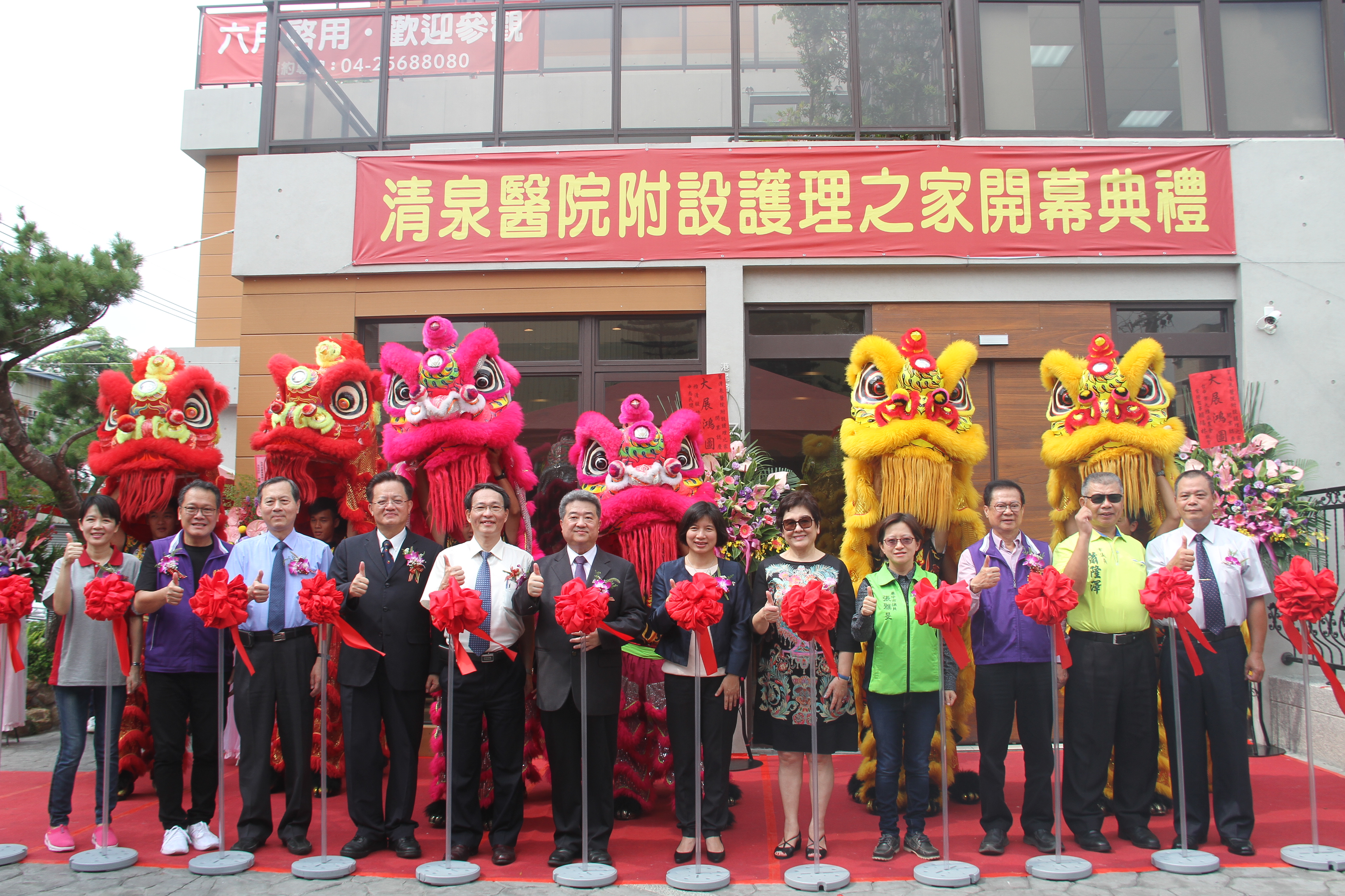 今(8)日副市長林依瑩、衛生局代理局長陳南松、消防局長蕭煥章、台中市議員陳成添、張雅旻、張立傑及蕭隆澤均出席開幕典禮。現場邀請惠明盲校樂團帶來樂曲演奏及寶興宮不老活力團進行太鼓表演,為開幕活動增添熱鬧氣氛,眾人並於剪綵儀式後參觀護理之家環境。
