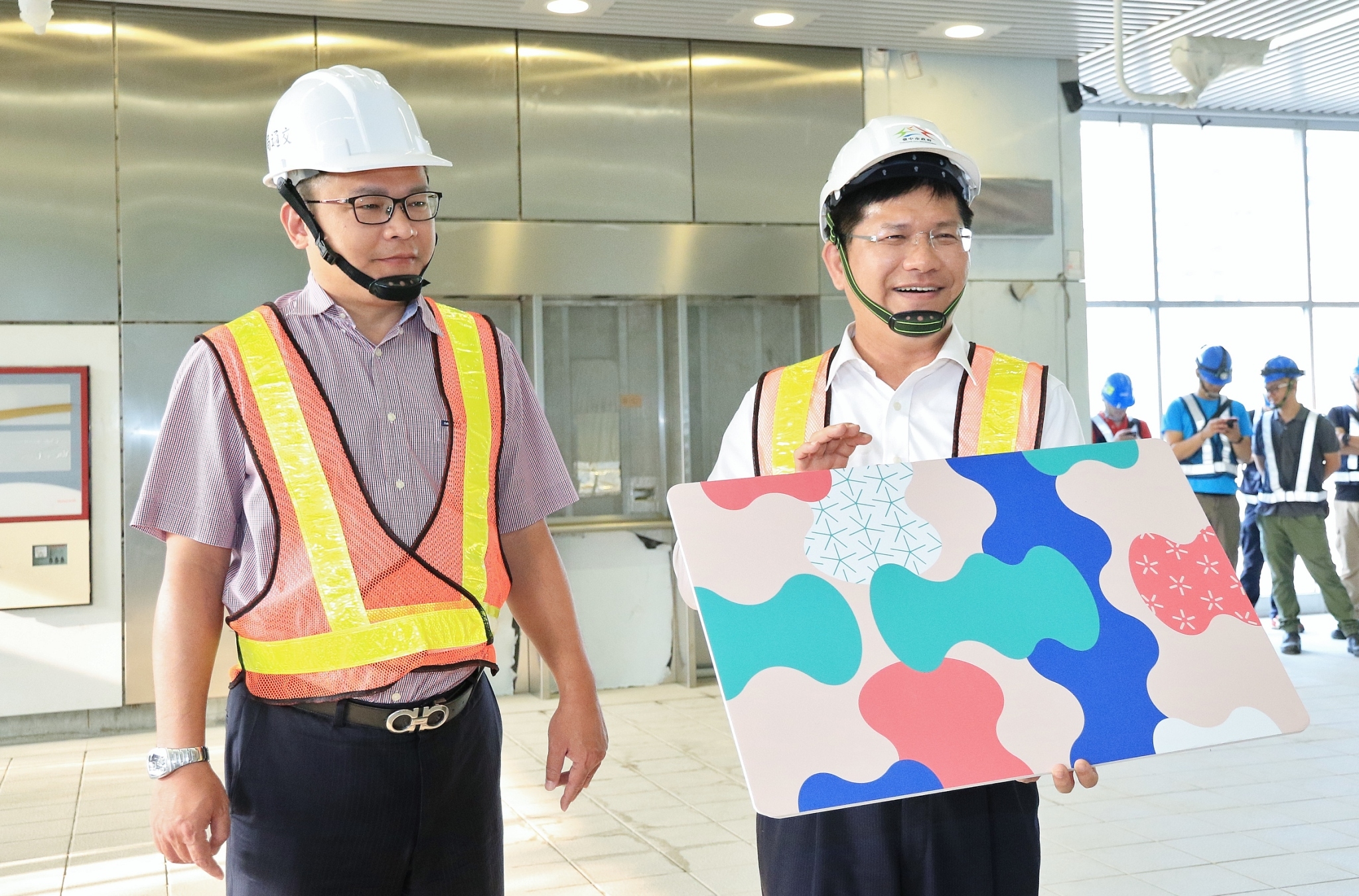 林市長今日在交通局長王義川的陪同下前往捷運G12站內部,由於台中捷運工程是委託北捷代辦,北捷機工處副處長許宗賢也到場介紹車廂內部空間,從站體內部逐步進入車廂,一一介紹閘門及電聯車的設計,也呈現捷運綠線的特色。