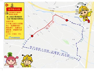 建設局指出,神岡區豐洲路路平工程全長約1.4公里,施工範圍從豐洲路六張路口,延伸至神岡下寮地區。7月19至20日已完成路基及部分排水溝改善,8月11日進行路平,以調撥車道方式施工,為免交通壅塞,建議用路人採替代道路改由大圳路、民權路、厚生路通行。