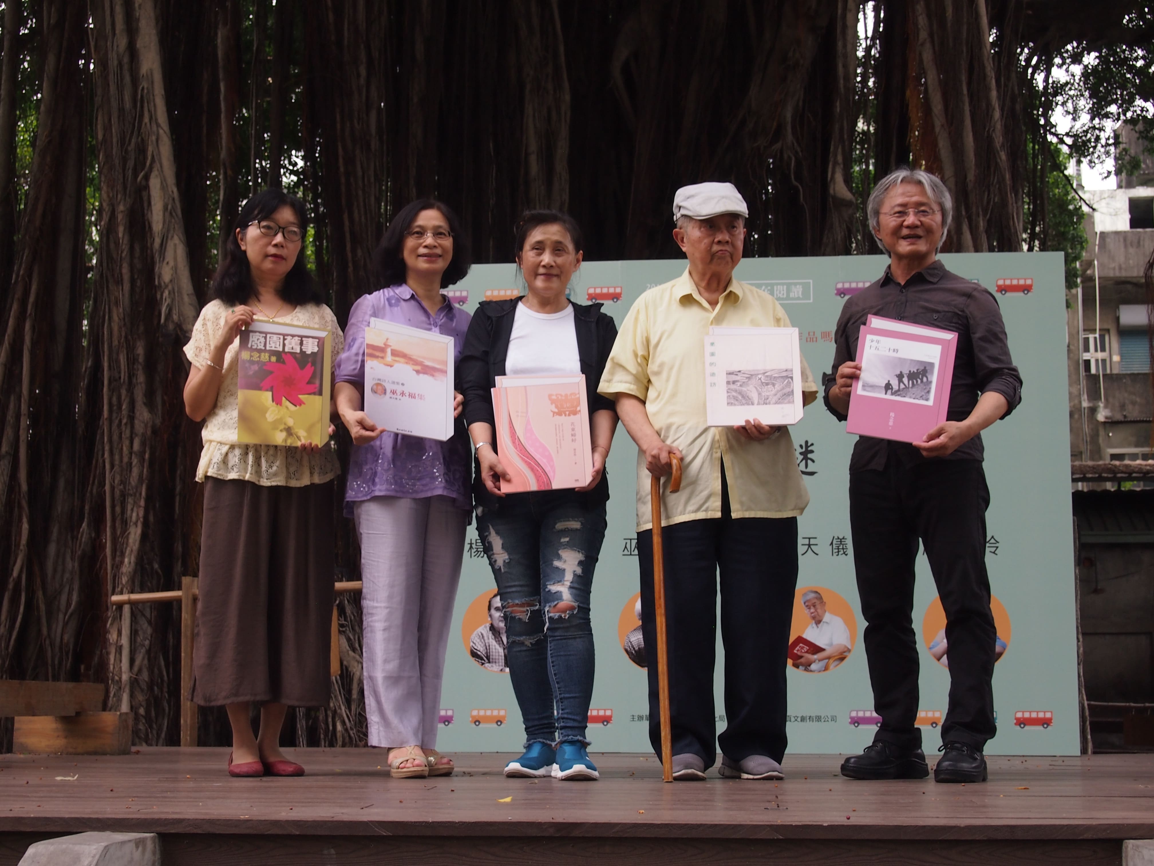 (公板1)公車作家跟代表楊明、許俊雅、周芬伶、趙天儀,及文化局長王志誠(由左至右)。