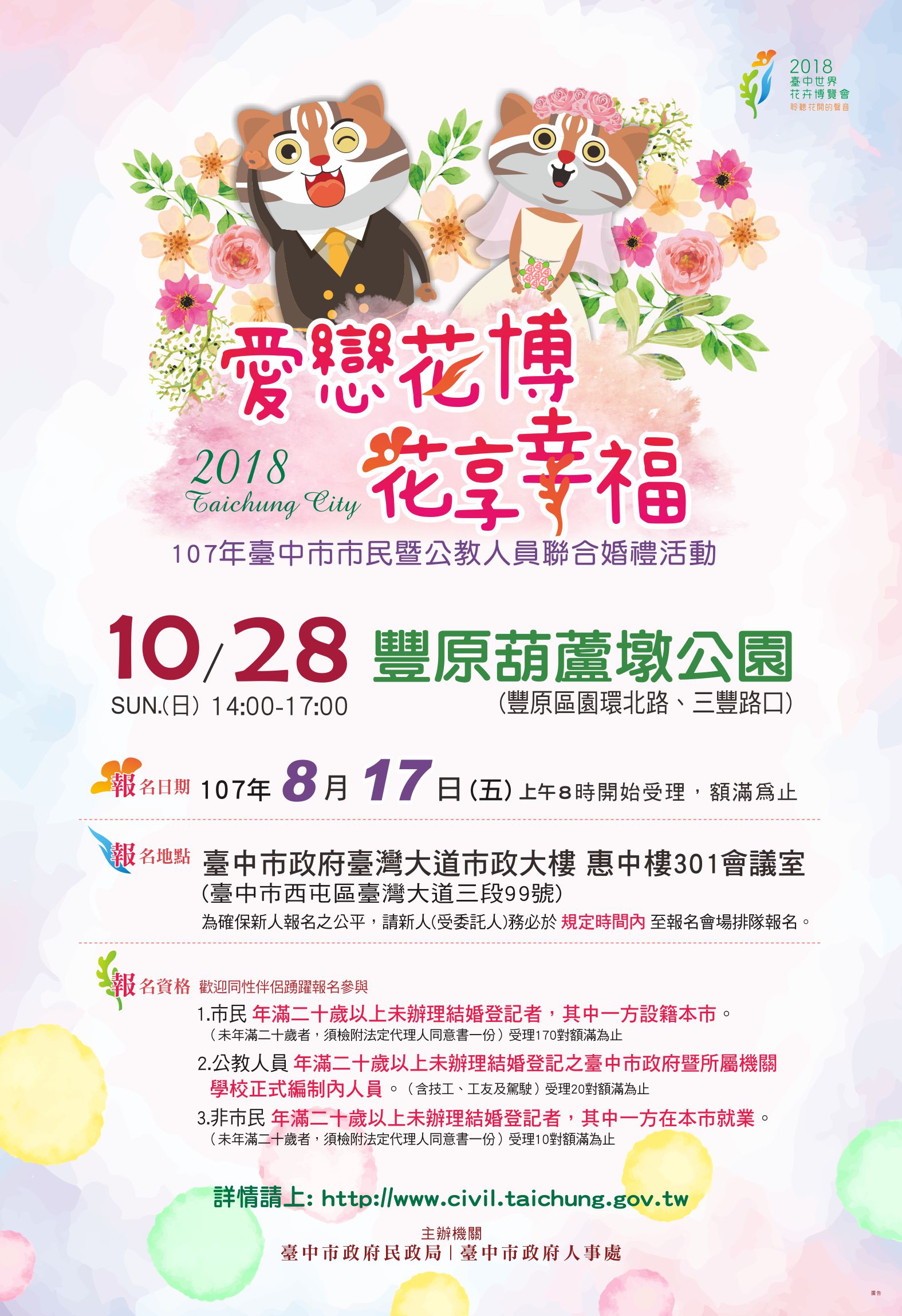 迎接2018台中世界花卉博覽會11月3日開幕,今年台中市民暨公教人員聯合婚禮活動將在10月28日於花博展區之一的豐原葫蘆墩公園舉行,婚禮將融合展區意象,用花開的聲音,為新人譜出畢生難忘的幸福樂章;聯合婚禮活動8月17日七夕當天在台中市政府台灣大道市政大樓惠中樓301會議室受理報名,名額共計200對,歡迎踴躍報名。