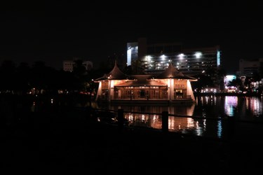 園區內亮點「湖心亭」屋簷滴水線加裝LED線條燈、下照筒燈,並在亭內裝設10至20瓦數的投光燈,夜間遠望猶如一座矗立湖中的美麗宮殿。此外,日月湖底也裝設LED水底燈,利用水景及燈光變幻展現層次感,並隨著時間和噴泉變化,調配投射燈光變換顏色,晚間也能清楚看見噴泉水舞之美。