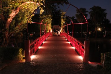 日月湖上充滿日式風情的「中山橋」和中式磚造的「中正橋」也重塑燈光。中山橋安裝赭紅色的線條燈打亮橋面,橋底下兩側裝設投光燈,打亮牆底下紅色結構,看起來就像一座牛郎與織女相會的浪漫紅鵲橋;中正橋則在拱橋兩岸安裝投射燈,並在每個柱邊裝設踢腳燈,加上橋底中央的投光燈,凸顯出橋身美感與流線感。