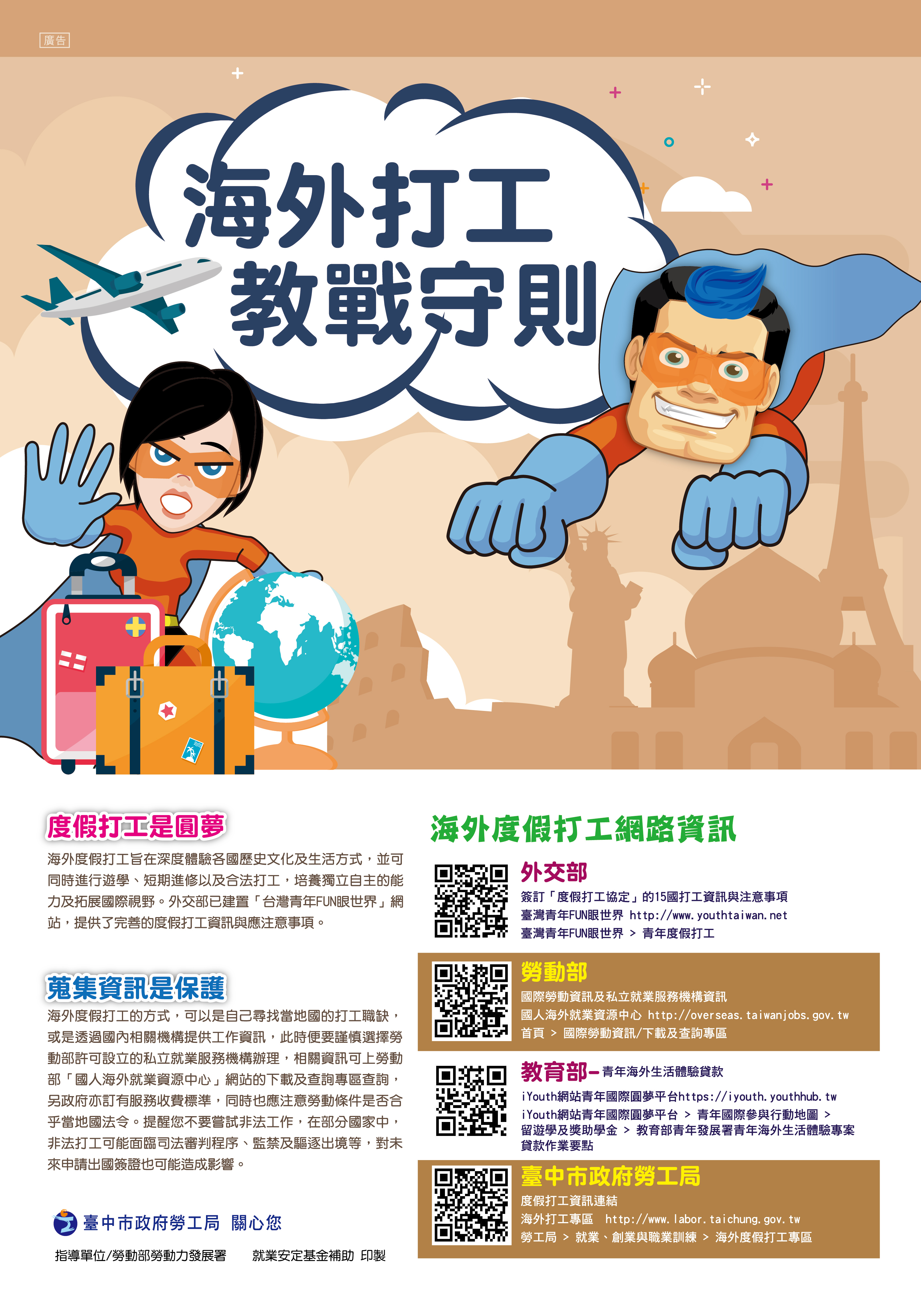 此外,海外渡假打工是目前相當受青年喜愛的工讀方式,教育部青年發展署今年公布海外生活體驗年齡上限調整為35歲,讓更多年輕人能前往外國體驗職場。勞工局也呼籲,出國工作要更仔細防範詐騙,確認仲介及工作機構的合法性,保護好個資證件,詳細審閱契約內容並留存。