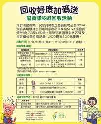 為加強廢3C物品回收,台中市政府環保局日前與NOVA廣場合作推出「回收好康加碼送」活動,只要將廢筆記型電腦、平板電腦及鍵盤等物品帶到NOVA回收,即可兌換現金抵用券,還有機會參加抽獎,即日起至9月16日截止,歡迎踴躍參加。