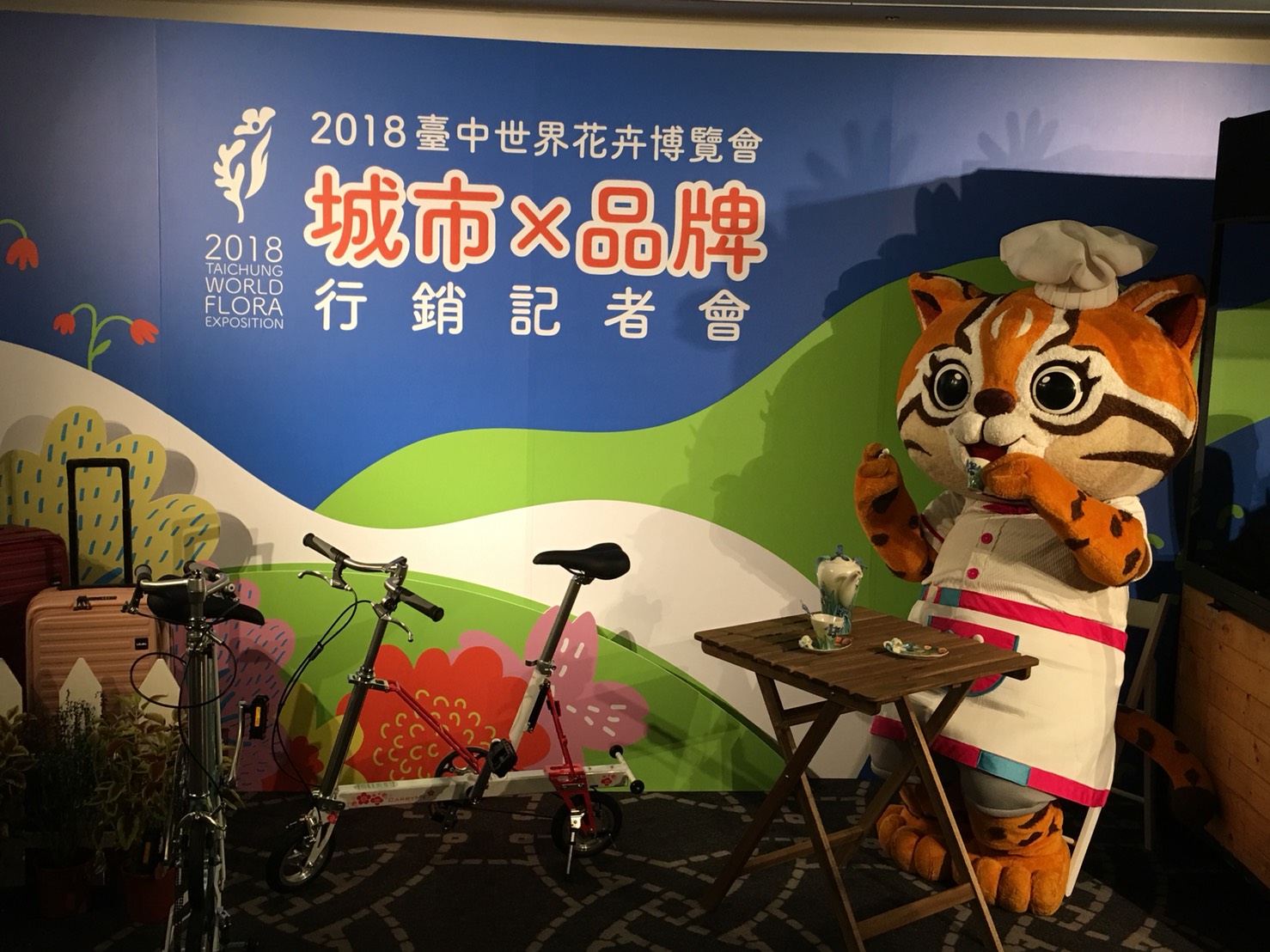 台中市政府觀光遊遊局今(21)日在台北晶華酒店舉辦「2018台中世界花卉博覽會 城市X品牌 國內行銷記者會」,包括花博意象結合法藍瓷瓷藝、太平洋自行車彩繪自行車款、美冠皮件旅行箱、氧顏森活Forest Beauty面膜、獅子寶寶濕紙巾以及由石尚企業精心製作的仿真石虎玩偶等花博專屬品牌正式亮相。