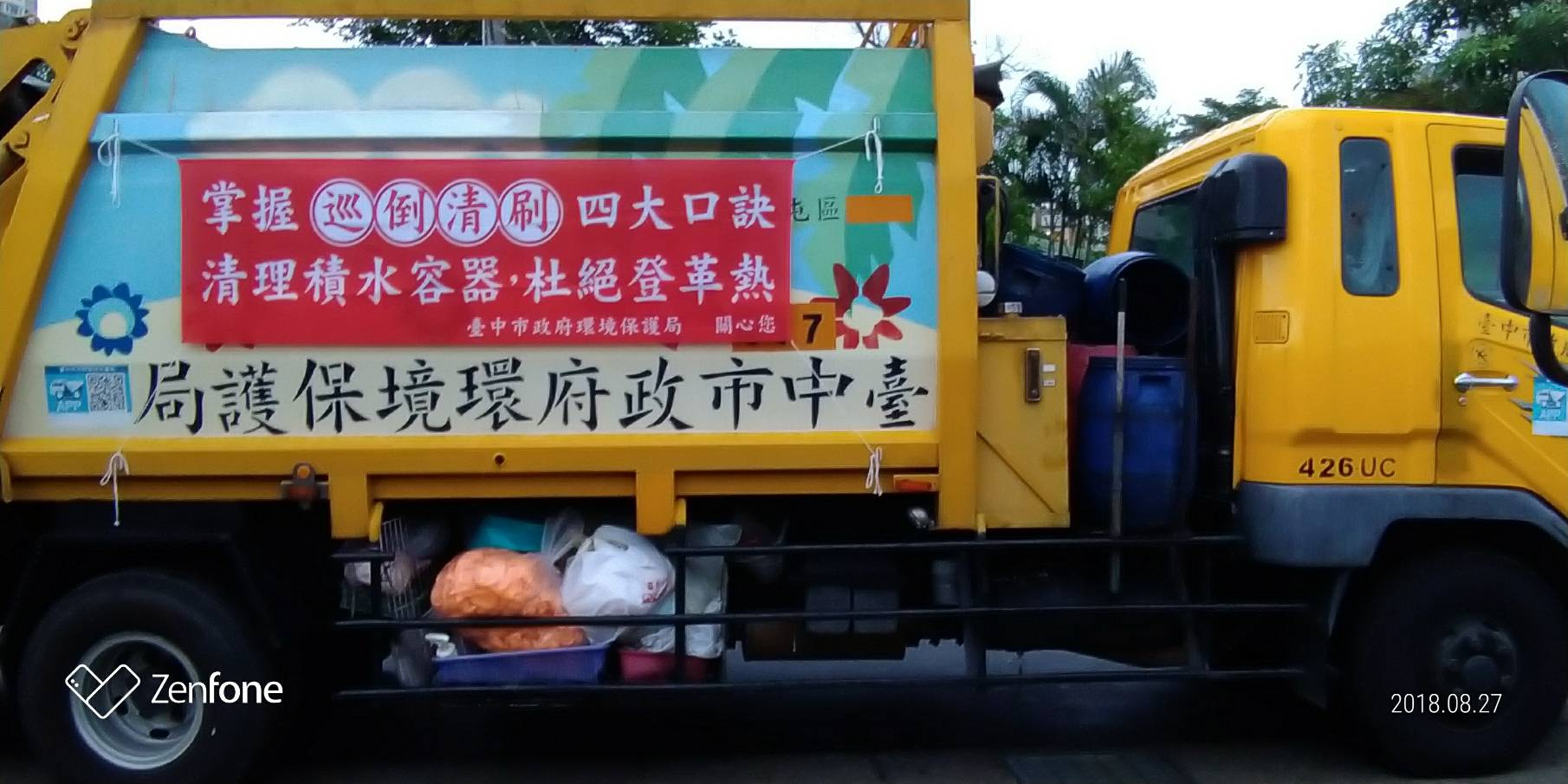 為防堵登革熱疫情蔓延,台中市政府環保局在8月21日宣布成立登革熱應變小組後,隨即在23日啟動登革熱防治週全體總動員,加強家戶稽查巡檢,並於大里區「開心農場」及周圍6個高風險熱區採取化學噴藥防治,建立疫情防火牆。今日起更在各區隊清潔車上懸掛防治登革熱宣導紅布條,加強提醒民眾落實「巡、倒、清、刷」四大口訣,希望儘速徹底消除登革熱病媒蚊。