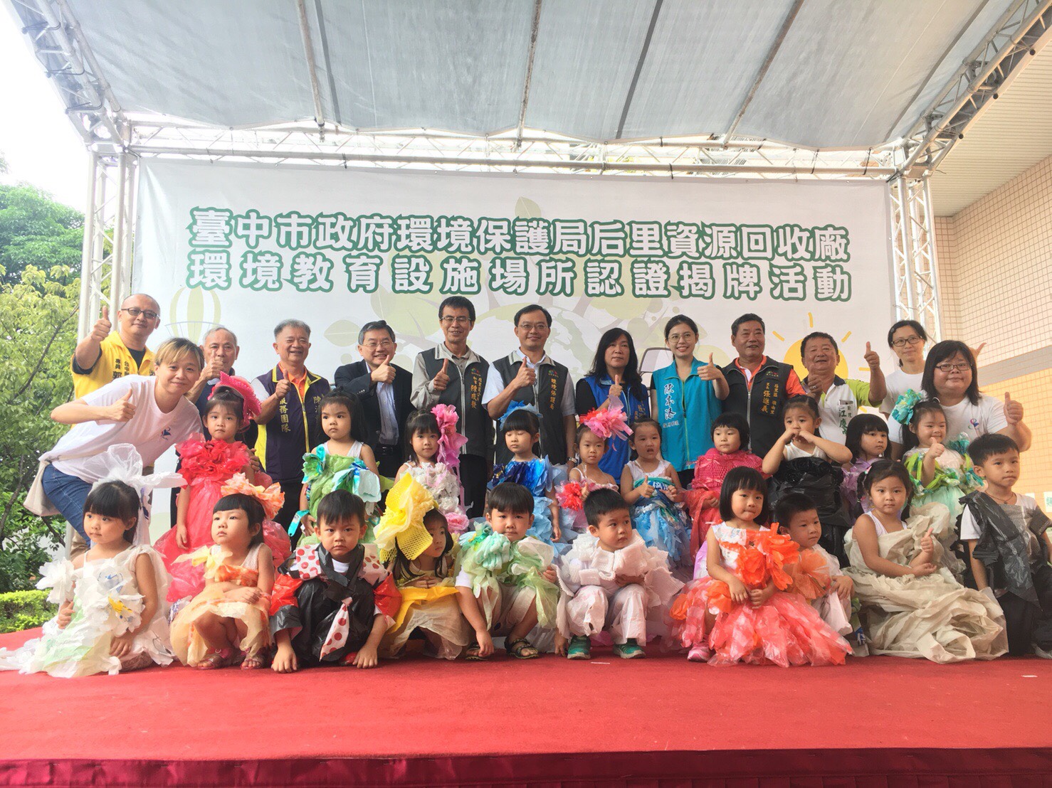 后里資源回收廠今日舉行揭牌儀式,由后里三采幼兒園的環保禮服走秀作為開場,20件造型特殊的環保禮服,都是利用回收的塑膠資源,讓幼兒設計製作,盼從幼兒教育中,深植藝術與環保概念,再推廣落實到每個家庭中。