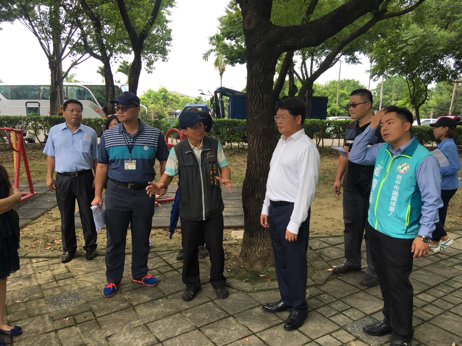 建設局長黃玉霖日前在太平區長陳小菲陪同下,會同市議員李麗華、張玉嬿,以及市議員候選人蔡耀頡、賴義凉主任、里長跟當地居民,前往太平區永成公園、豐年公園及八德公園視察有待改善之設施。