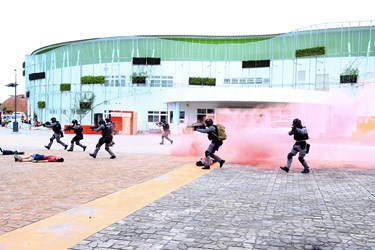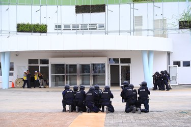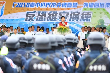 2018台中世界花卉博覽會將於11月3日開幕,為進一步強化大型活動反恐維安工作,今(30)日市府於花博外埔園區樂農館前廣場舉行反恐維安演練,提升維安能量,確保花博順利圓滿。林市長現場督導演練過程時表示,花博是世界級的活動,預計半年內將吸引800萬人次來參觀,台中市必須做好所有維安準備工作,肯定今日演練相當專業,並期勉一切準備陸續到位,迎接花博盛會到來。