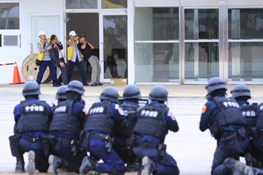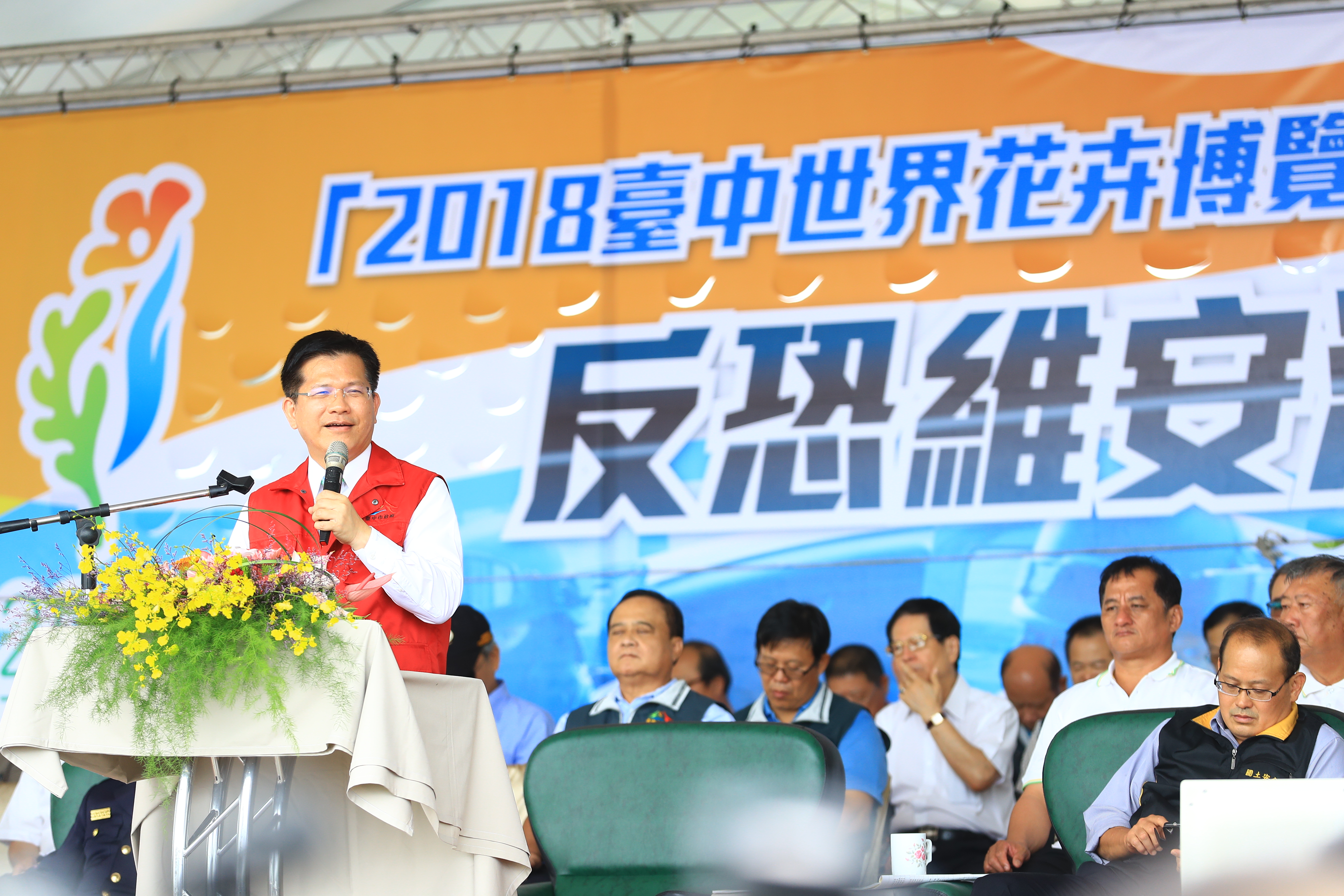 警察局今日舉辦「2018台中世界花卉博覽會反恐維安演練」,林市長在警察局長楊源明的陪同下出席,包括行政院國土安全辦公室副主任黃正方、內政部警政署保安組科長王炳睿、內政部警政署保安警察第一總隊主秘邱聰雲、國安局中部工作站站長許清仁、台中市後備指揮部指揮官蘇淵銓、調查局台中市調查處副處長陳秀芬及多位市府市政顧問等人均到場。