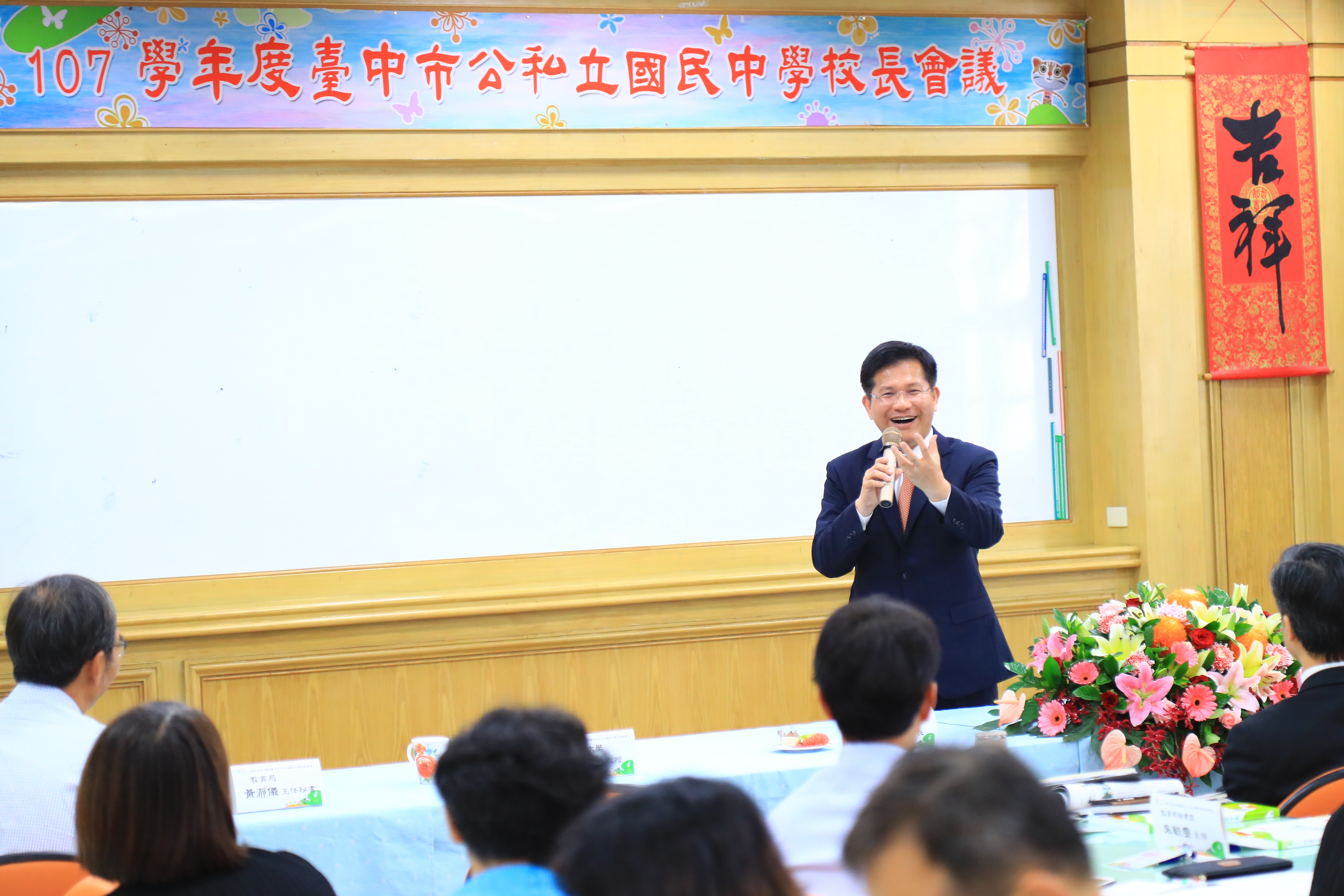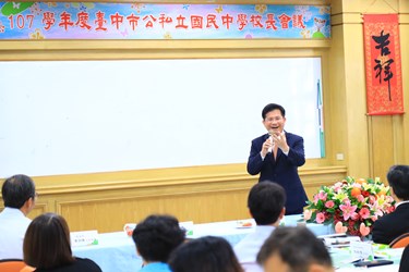 107學年度「台中市公私立國民中學校長會議」今(31)日在向上國中舉辦, 97位公、私立國民中學校長齊聚一堂,市長林佳龍也親自出席與校長們,針對美感教育及人本教育等議題,進行雙向溝通交流;林市長指出,升上國中的孩子漸漸成熟,處於逐漸型塑自我個性的階段,需要大人用心的陪伴及關懷,此外他也希望透過花博打造花園城市的契機,建立城市美學並推廣美感教育。