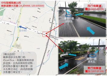 為改善中科陸橋機車道排水問題,建設局勘查後將優先設置排水溝及橫向截水設施,加強路面排水能力,豪大雨預警期間也將加強巡檢,保持側溝格柵排水順暢,降低積淹水發生。