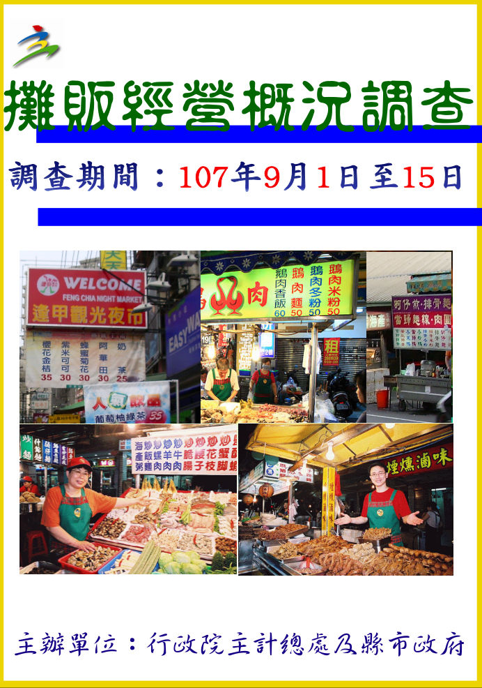 「攤販經營概況調查」由行政院主計總處規劃,委託市府主計處每五年舉辦的統計調查,目的蒐集最近一年攤販經營狀況、社會背景及經營意願等,以彌補普查資料的不足,健全工業及服務業統計,並供為編算國民所得、施政決策與研究經濟、社會問題的參考依據。