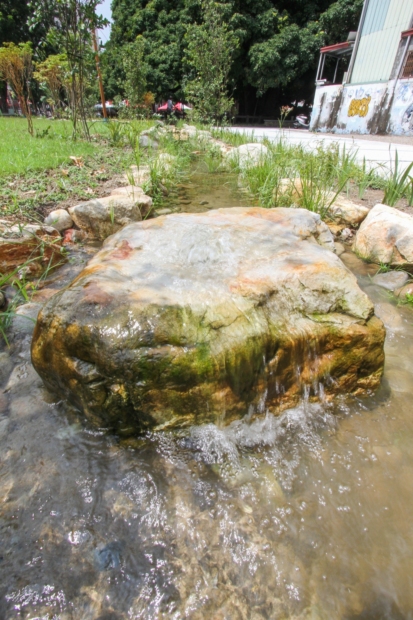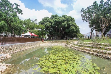 建設局黃局長表示,「茄苳樹王文化生態公園」不僅有大面積陽光草坪、符合無障礙規範的透水性步道,並種植多種適合當地生長的喬、灌木,創造開放性都市綠地空間供市民使用;而拆除婦幼活動中心所發現的地下湧泉,也採用自然工法設置荷蓮共生的景觀生態池,配合公園內的砌石水道,復刻古時湧泉水景。