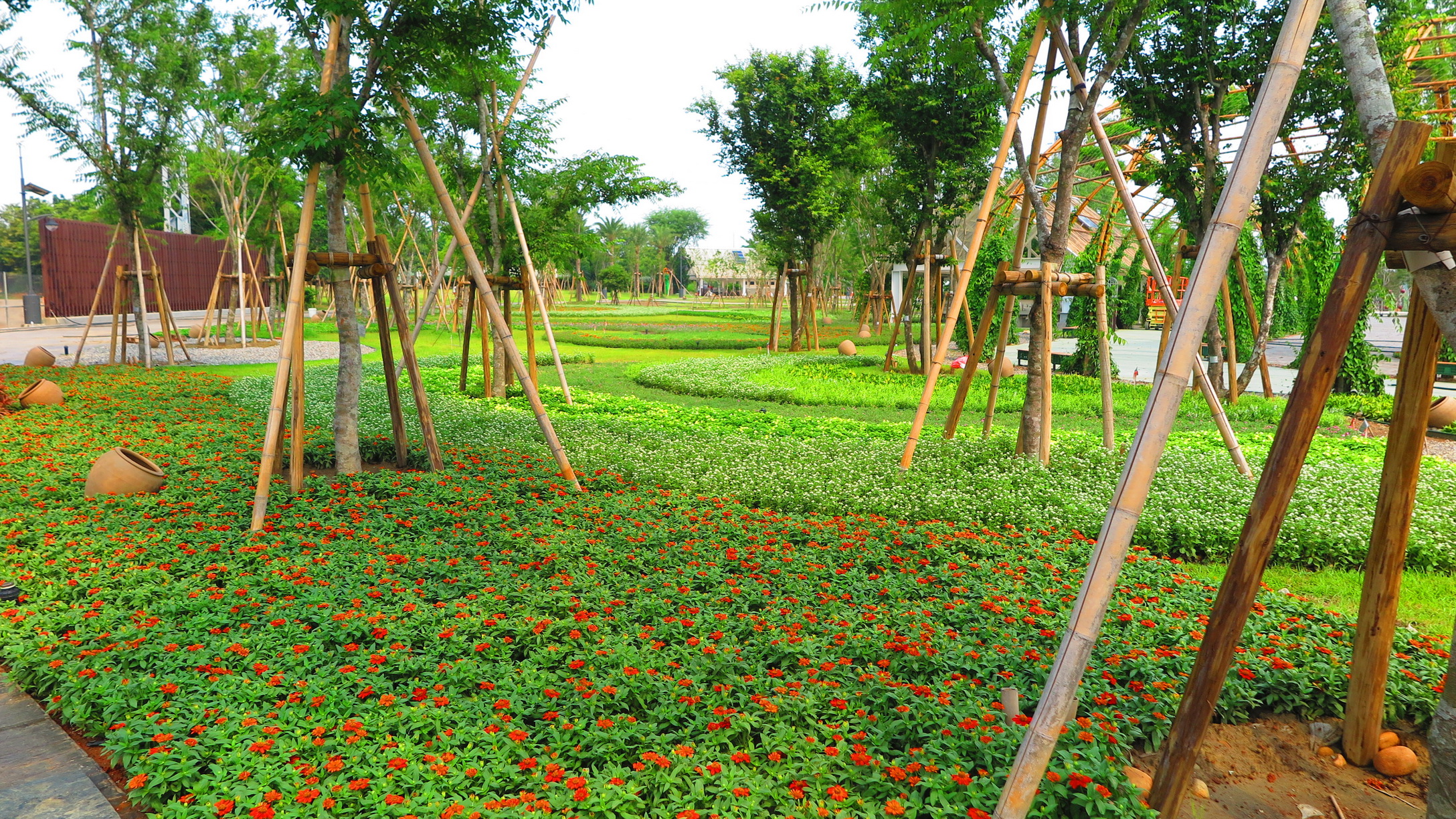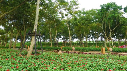 「樂農館」外的生態池水生植栽,包括大木賊、睡蓮、紫蠟燭、大王蓮、菱角、荷花、台灣萍蓬草等,以及分布於入口無患子花道及生命之花等區域的草花,包括小百日草、天使花、夏菫、孔雀菊、羽狀雞冠、萬壽菊等,都已於831日前完成分區種植,讓外埔園區彷彿穿上繽紛的花衣。