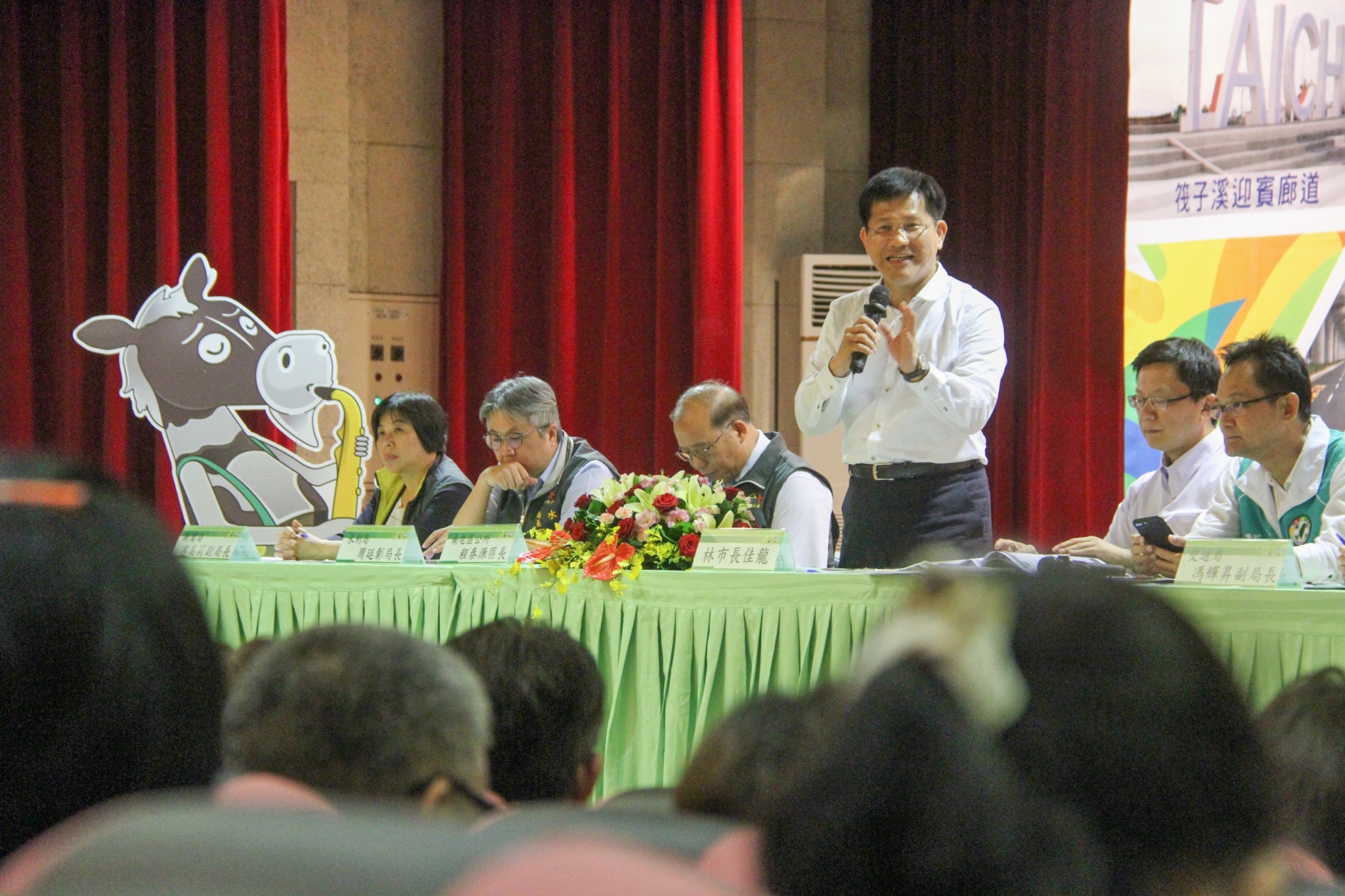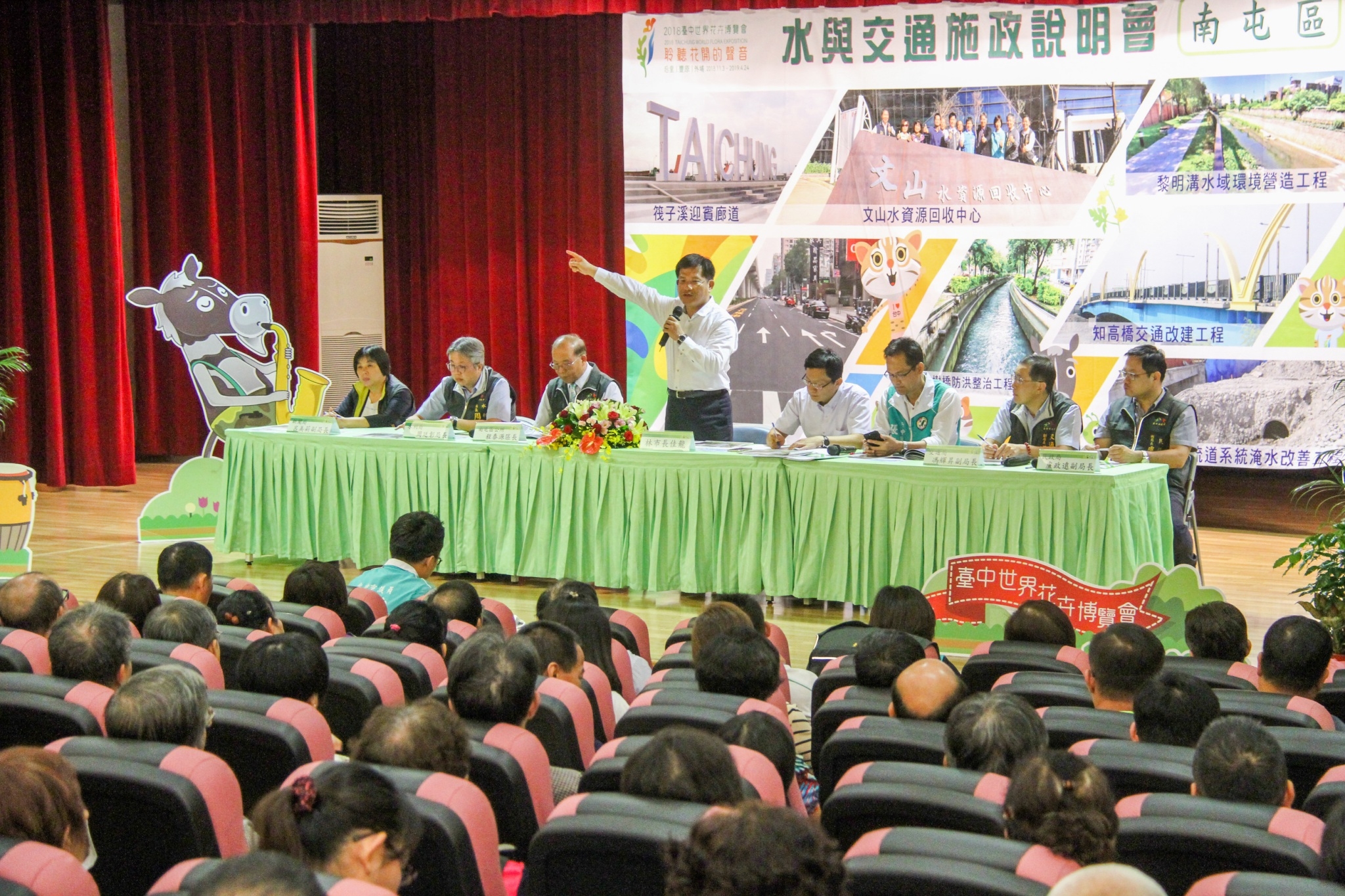 今日南屯區「水與交通施政說明會」由林市長主持,水利局長周廷彰、交通副局長馮輝昇進行簡報,說明南屯區前瞻水利建設及捷運綠線等交通規劃,民政局副局長盧政遠、新聞局副局長呂美莉、立委張廖萬堅、議員張耀中、議員何文海也出席,許多在地里鄰長及市民均到場關心。