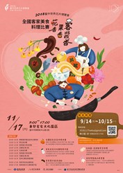 市府客委會「2018台中世界花卉博覽會-花香、果香、客醬香-全國客家美食料理比賽」報名開始,自914日至1015日止,活動總獎金62萬元,歡迎各路好手踴躍參與!