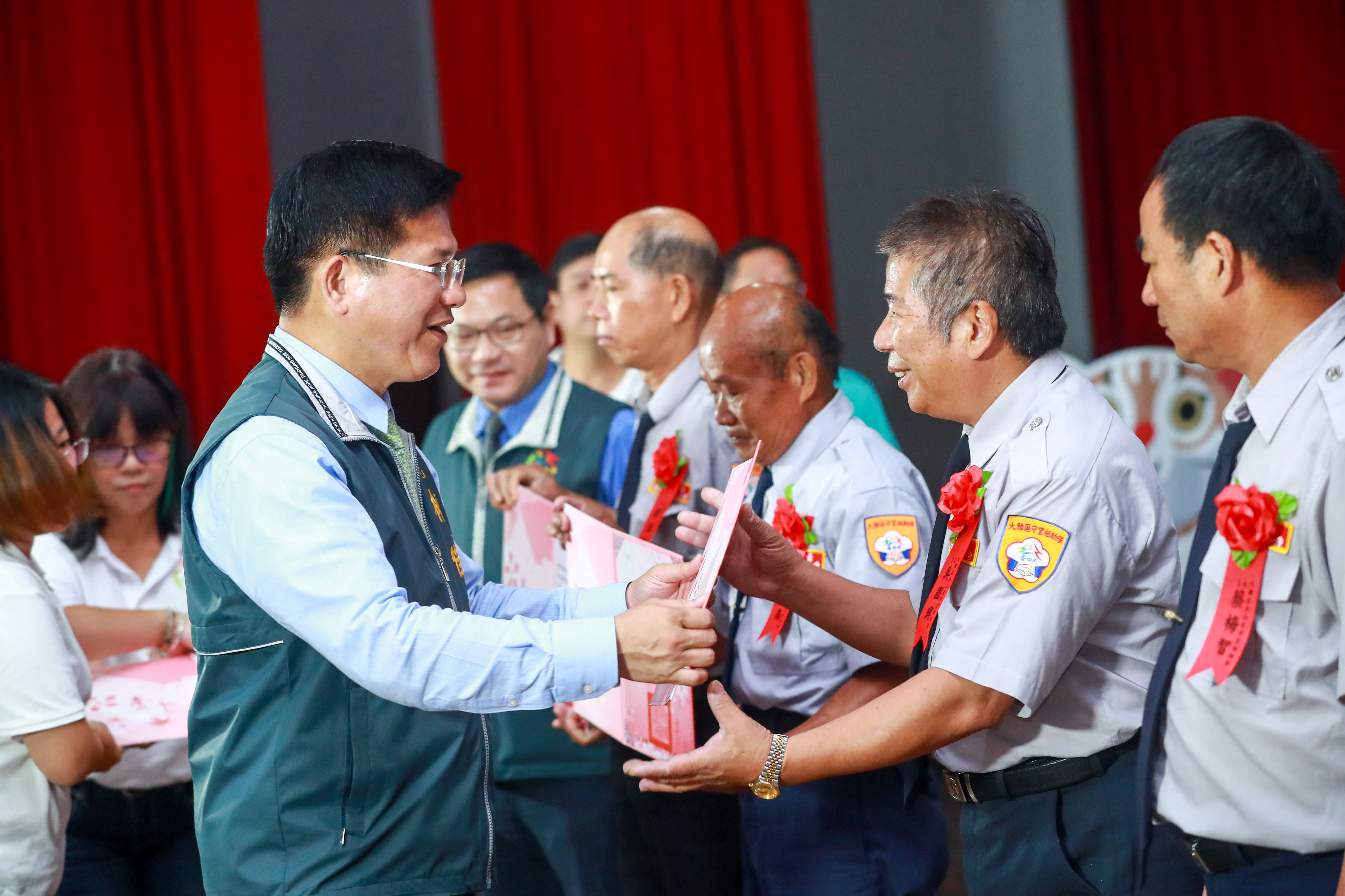 林市長今日在民政局副局長盧政遠及大甲、大肚、龍井、清水、梧棲、新社、神岡等區區公所代表的陪同下,出席於大甲高工學生活動中心舉辦的「台中市里守望相助隊資深暨退休隊員表揚大會」,市議員吳敏濟、立法院副院長蔡其昌服務處代表等人也到場致意。