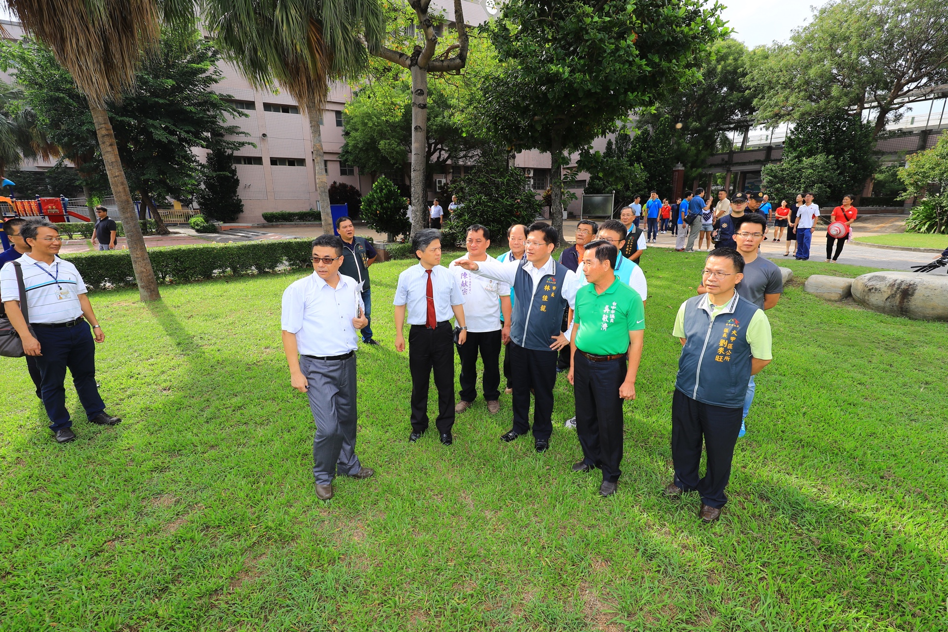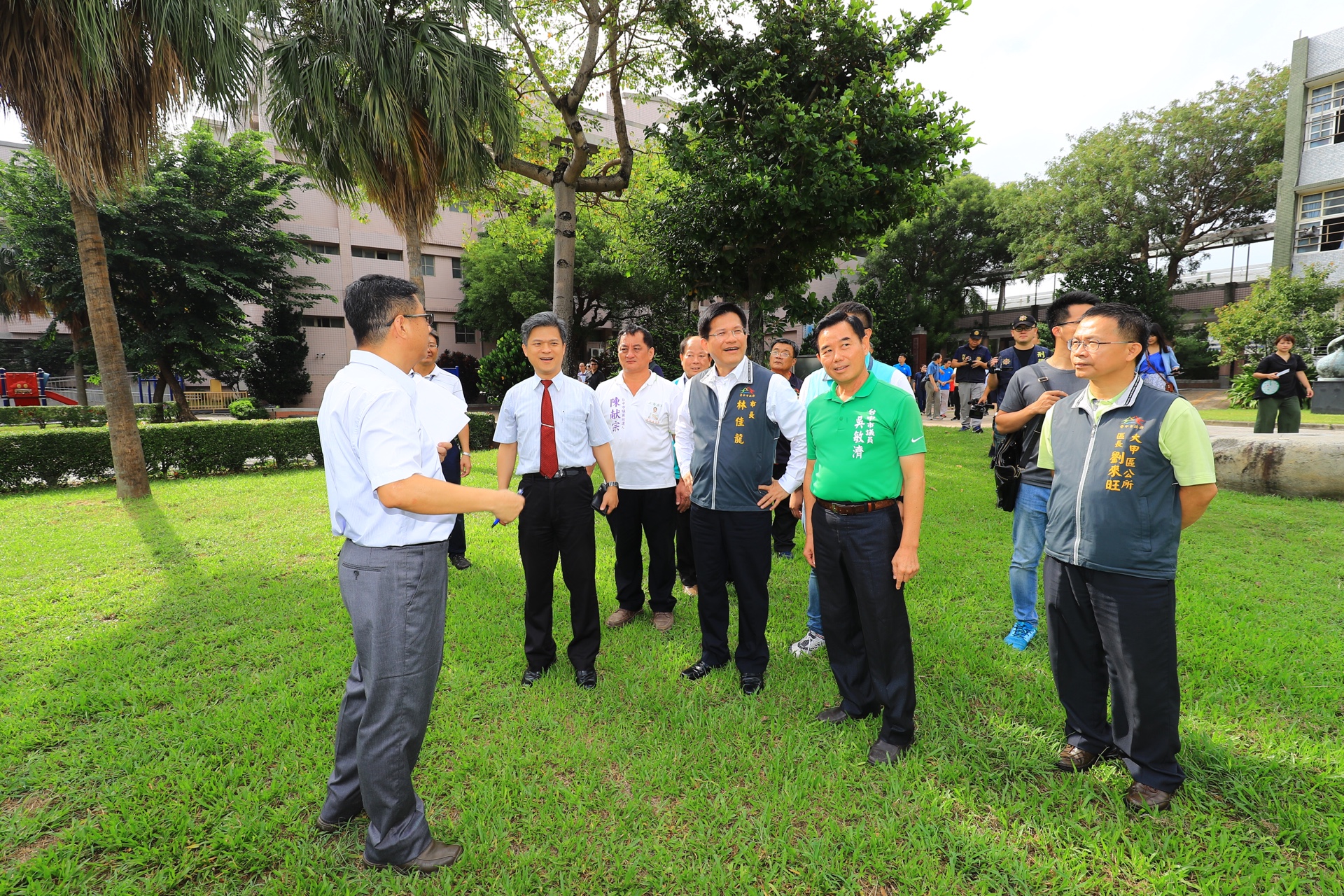 林市長今(18)日在教育局長彭富源、大甲區長劉來旺、文昌國小校長洪文鍊等人陪同下,前往視察活動中心興建工程預定地,市議員吳敏濟等人也到場關心。