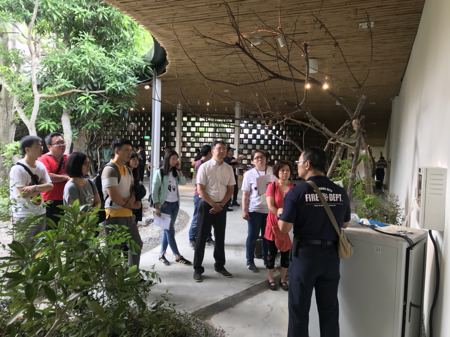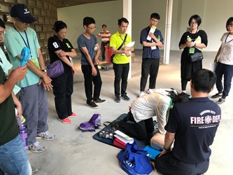 第二階段的「現地演練」則引導學員們實際前往展館內,模擬展館發生火災、地震、爆炸等情境時,如何進行展館內滅火、通報、避難引導、安全防護、救護班等措施,讓第一線應變人員在災害發生時,能有效啟動展館內自衛消防編組活動,採取緊急應變措施。