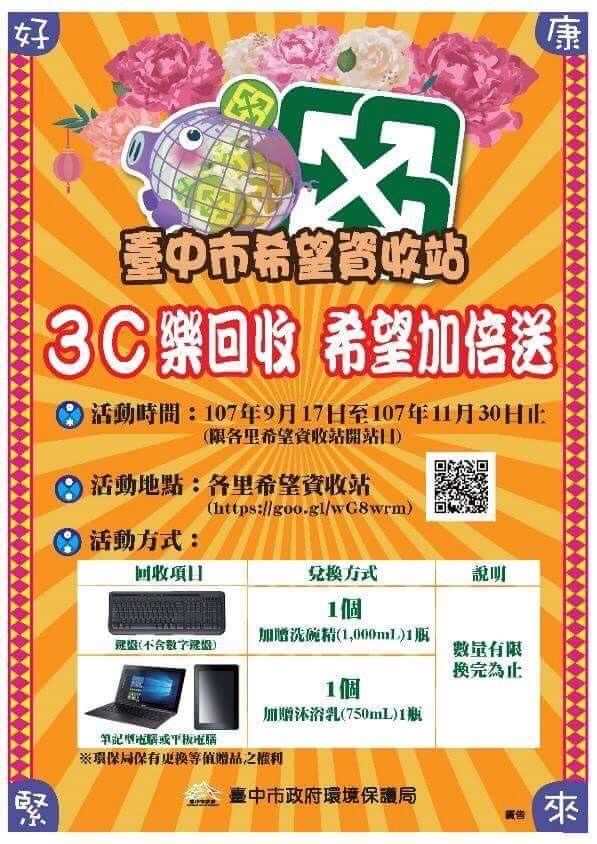 即日至11月30日止,推動希望資收站「3C樂回收、希望加倍送」回收兌換活動,里民將廢鍵盤、廢平板電腦或廢筆記型電腦送至希望資收站回收,除可兌換點數外,另加贈洗碗精或沐浴乳1份,數量有限,換完為止!