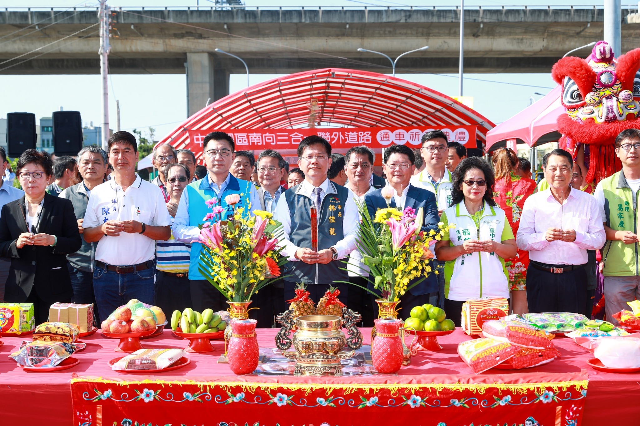 市府建設局今日舉行「中科園區南向三合一聯外道路」通車典禮,由林市長到場主持祈福儀式,包括中科管理局長陳銘煌、建設局長黃玉霖、立法委員江啟臣、洪慈庸服務處代表、市議員翁美春、陳本添、張瀞分、當地各里鄰長等人均到場觀禮。