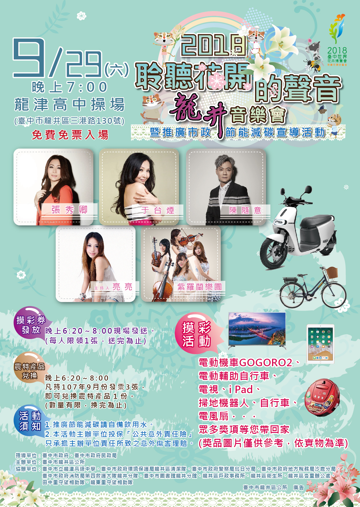 9月29日晚上7時龍井區公所在龍津高中操場舉辦「2018聆聽花開的聲音龍井音樂會暨推廣市政、節能減碳宣導活動」,邀請知名藝人張秀卿等多位歌手表演,免費免票入場;活動當天晚上6:20~8:00凡持107年9月份發票3張,即可兌換農特產品1份,數量有限,換完為止!