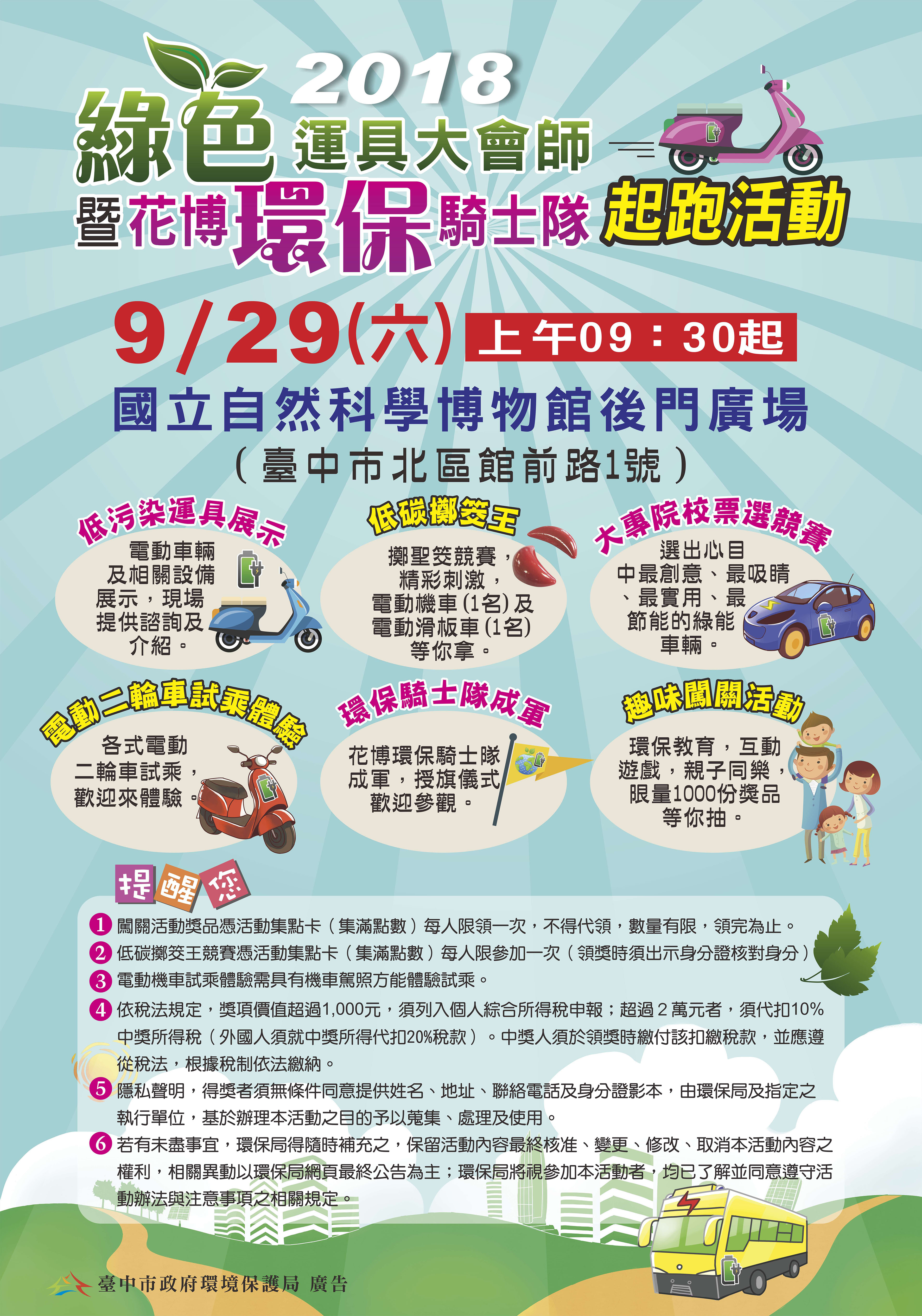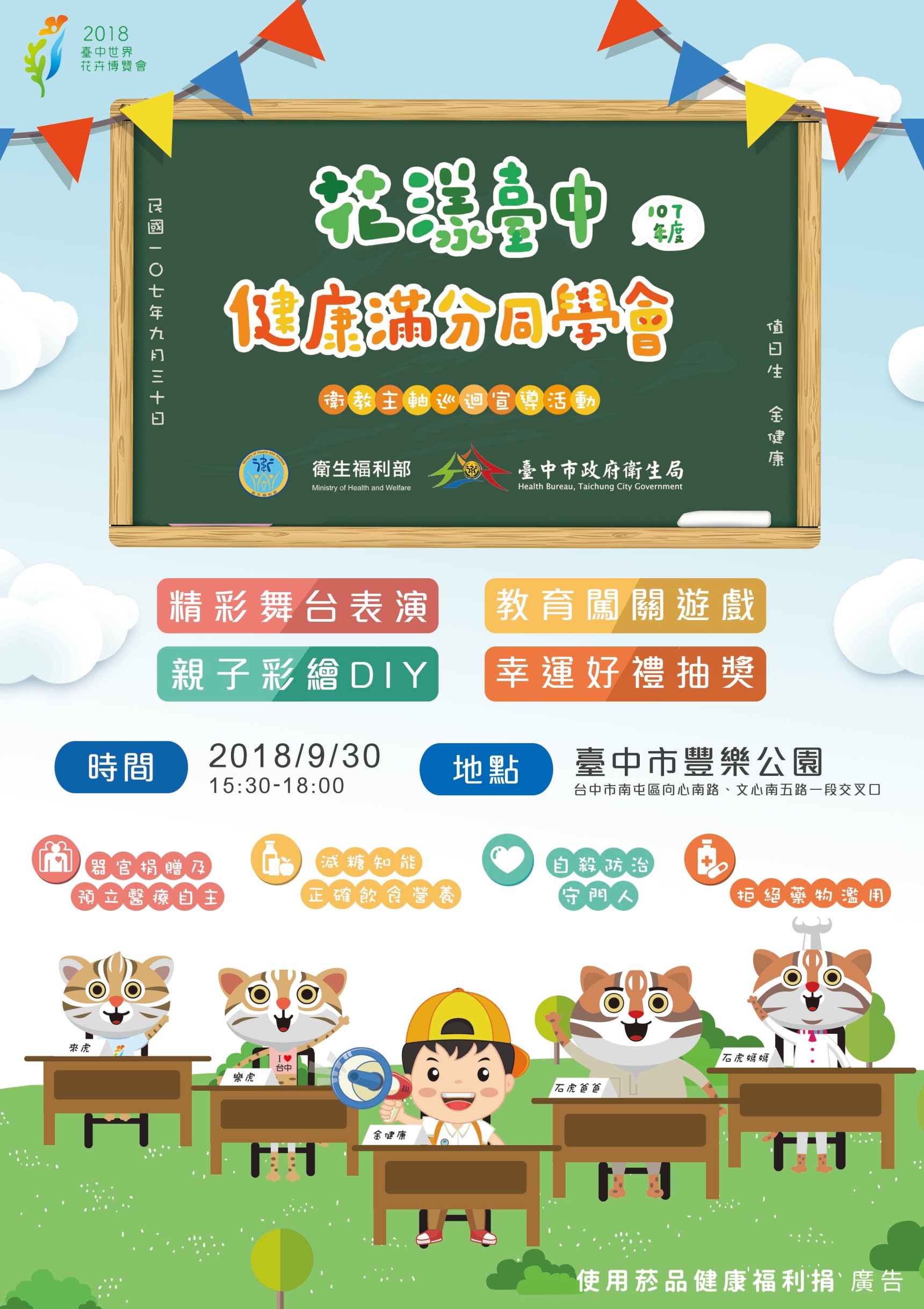 9月30日下午3時30分至6時,在豐樂公園(文心南五路與向心南路路口),一起來輕鬆學健康知識、闖關成功拿好禮,還可以親子彩繪DIY花博吉祥物面具,快來闖關吧,還有機會得到100元禮券!