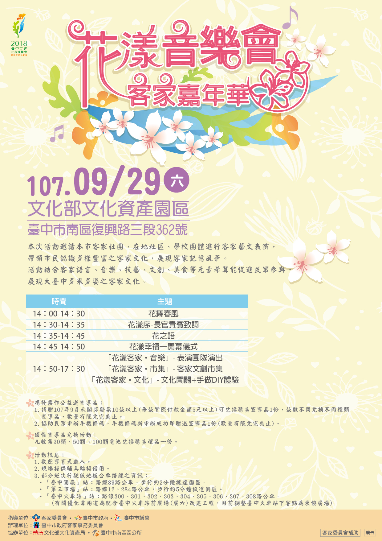 「2018台中客家國樂音樂會巡演活動」第2場活動,將於9月29日晚間7時30分至9時30分,在葫蘆墩文化中心演奏廳登場,節目內容豐富多元,邀您週末前往體驗大型國樂的震撼演出;9月29日下午2時至5時30分,在文化部文化資產園舉辦「花漾音樂會~客家嘉年華」活動,現場將有客家創意市集等活動,歡迎共襄盛舉!