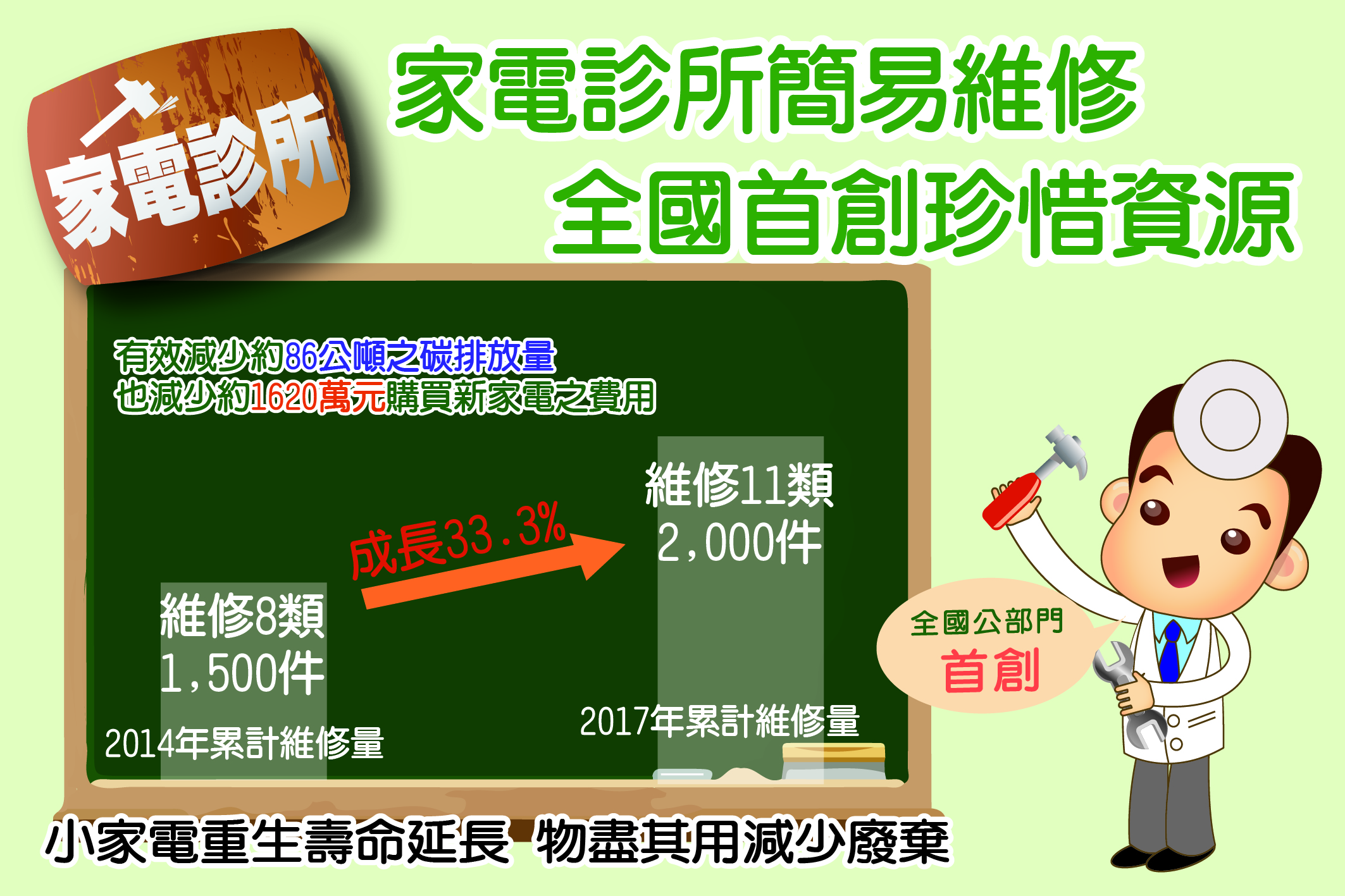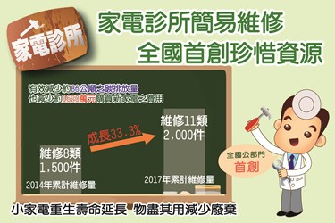 台中市家電診所為全國公部門首創,特別針對小家電進行維修再生,使小家電壽命延長,並達到物盡其用喔! 從2014年至2017年維修成長提升了33.3%,並減少了86公噸的碳排放量及1,620萬元購買新家電費用,創造循環經濟之價值。