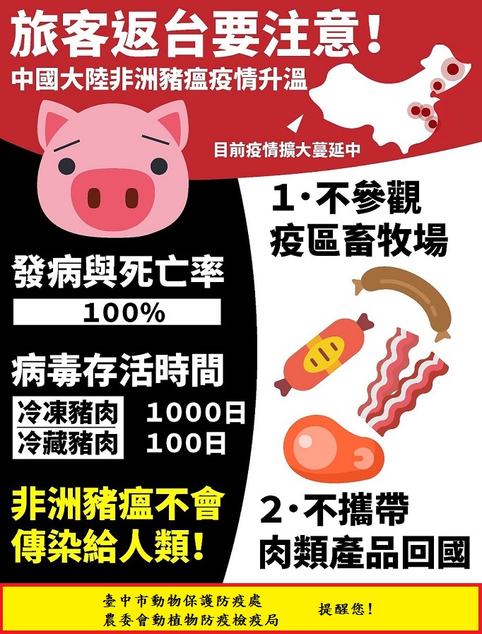 民眾出國旅遊,請勿夾帶中國大陸豬肉產品,防範非洲豬瘟疫病傳入造成疫情發生,確保台灣的養豬產業永續經營發展,有效阻絕非洲豬瘟病毒在台灣境外。