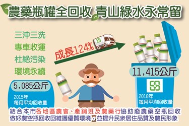 台中市政府結合各地區農會、產銷班及農藥行協助對農民進行廢農藥空瓶回收宣導,農民將廢農藥罐三沖三洗後,交由清潔隊以專車進行收運,杜絕環境污染,維護環境永續。自104年起到107年每月平均回收量成長124%,請大家一起努力回收作環保!