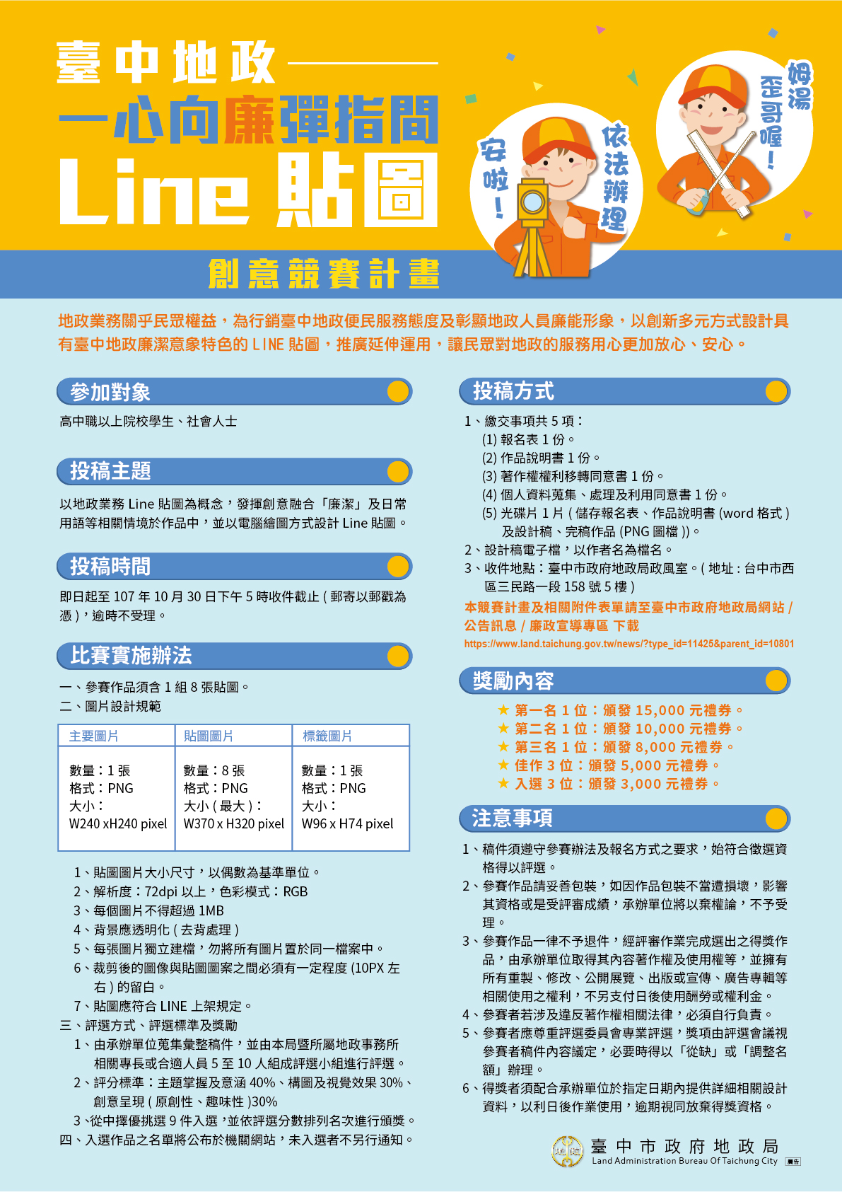 ★獎勵方式: 第一名1位:頒發15,000元禮券。 第二名1位:頒發10,000元禮券。 第三名1位:頒發8,000元禮券。 佳作3位:頒發5,000元禮券。 入選3位:頒發3,000元禮券。 ★投稿方式及相關注意事項,請詳閱「台中地政·一心向廉彈指間Line貼圖創意競賽計畫」。(請至台中市政府地政局網站-公告訊息-廉政宣導專區下載。)