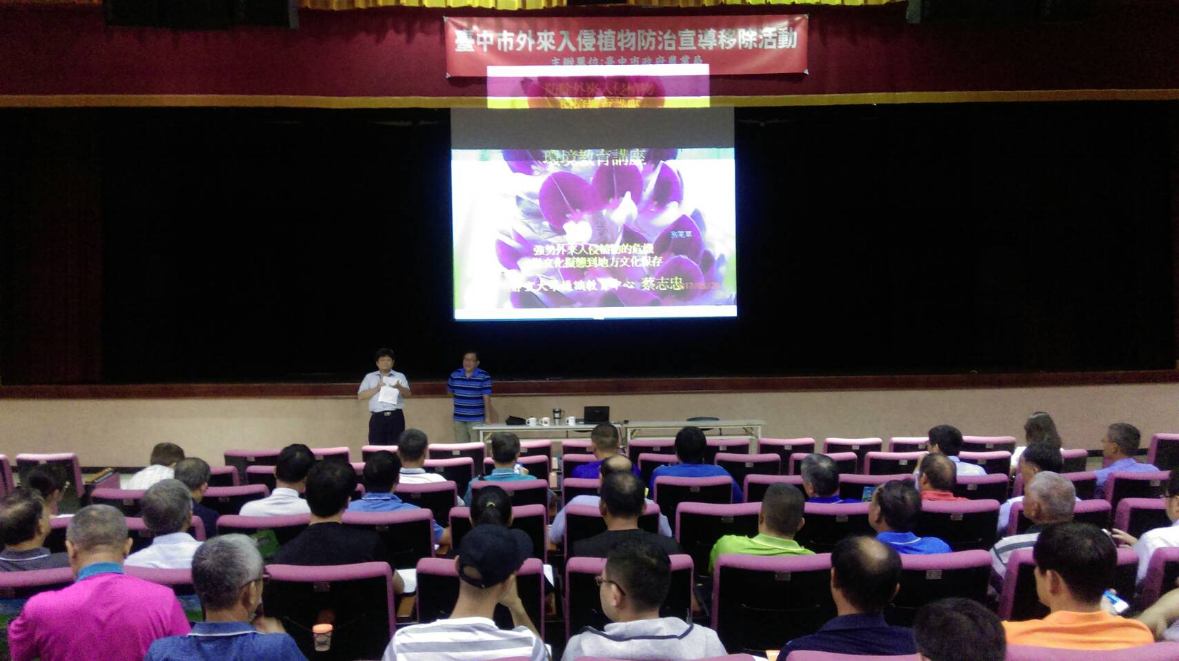 今日的教育訓練邀請靜宜大學教師蔡志忠講解各種入侵植物生長特色與防除技巧,並說明正確防治觀念與方法,吸引許多農事人員參加。