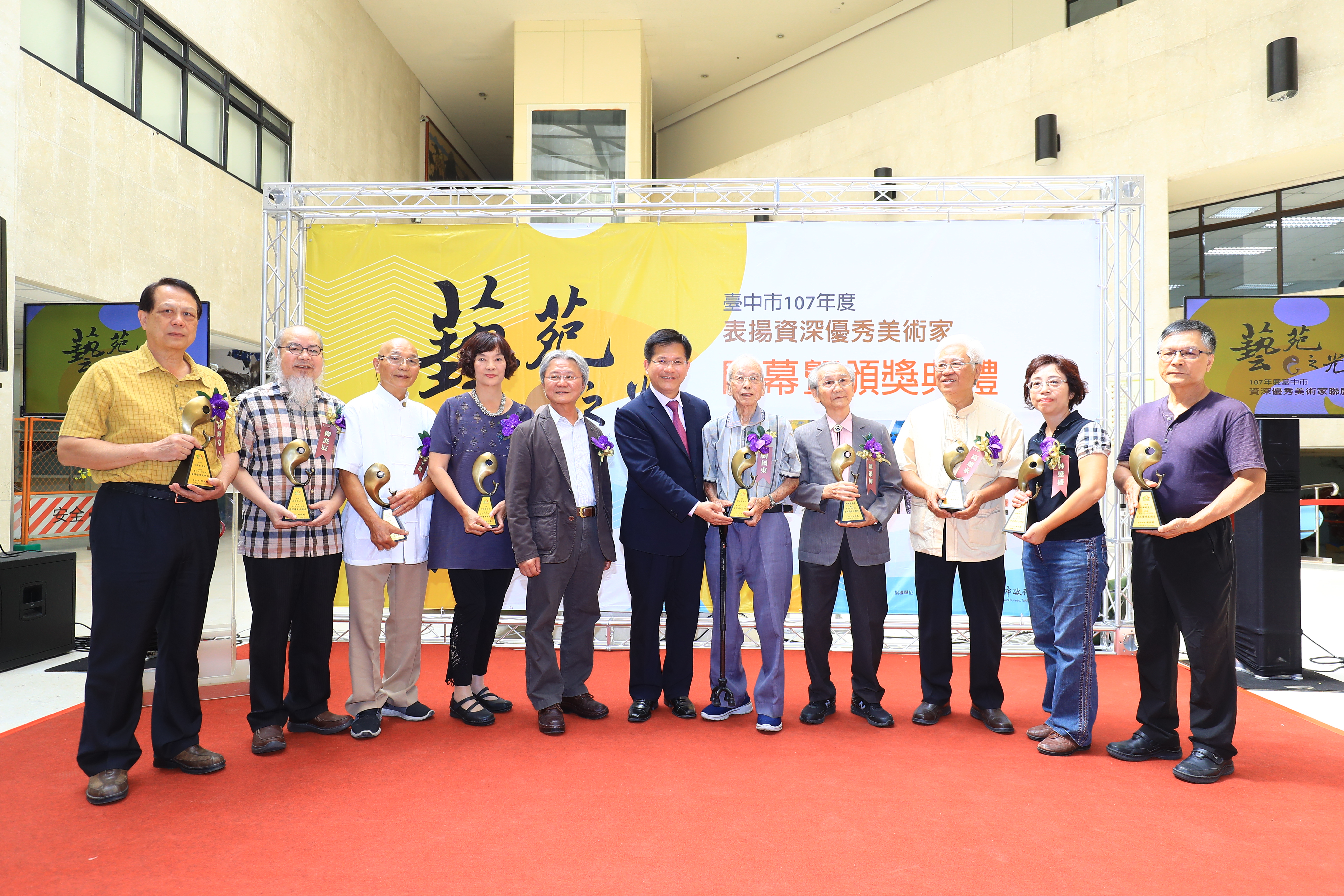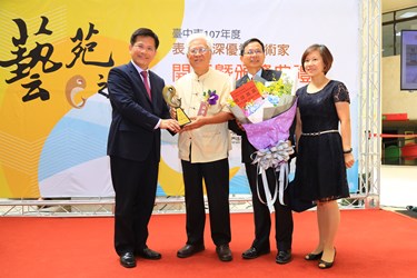文化局今日舉辦「台中市資深優秀美術家」頒獎典禮,由市長林佳龍親自頒授獎座給9位藝壇大師,包括劉國東、陳銀輝、林懋盛、李賜鎮、楊平猷、高連永、陳淑嬌、林輝堂、柳炎辰,市議員陳清龍也到場祝賀。現場展出作品共計45件,媒材橫跨油畫、膠彩、雕塑、水墨、書法、篆刻,創作風格多元精采。